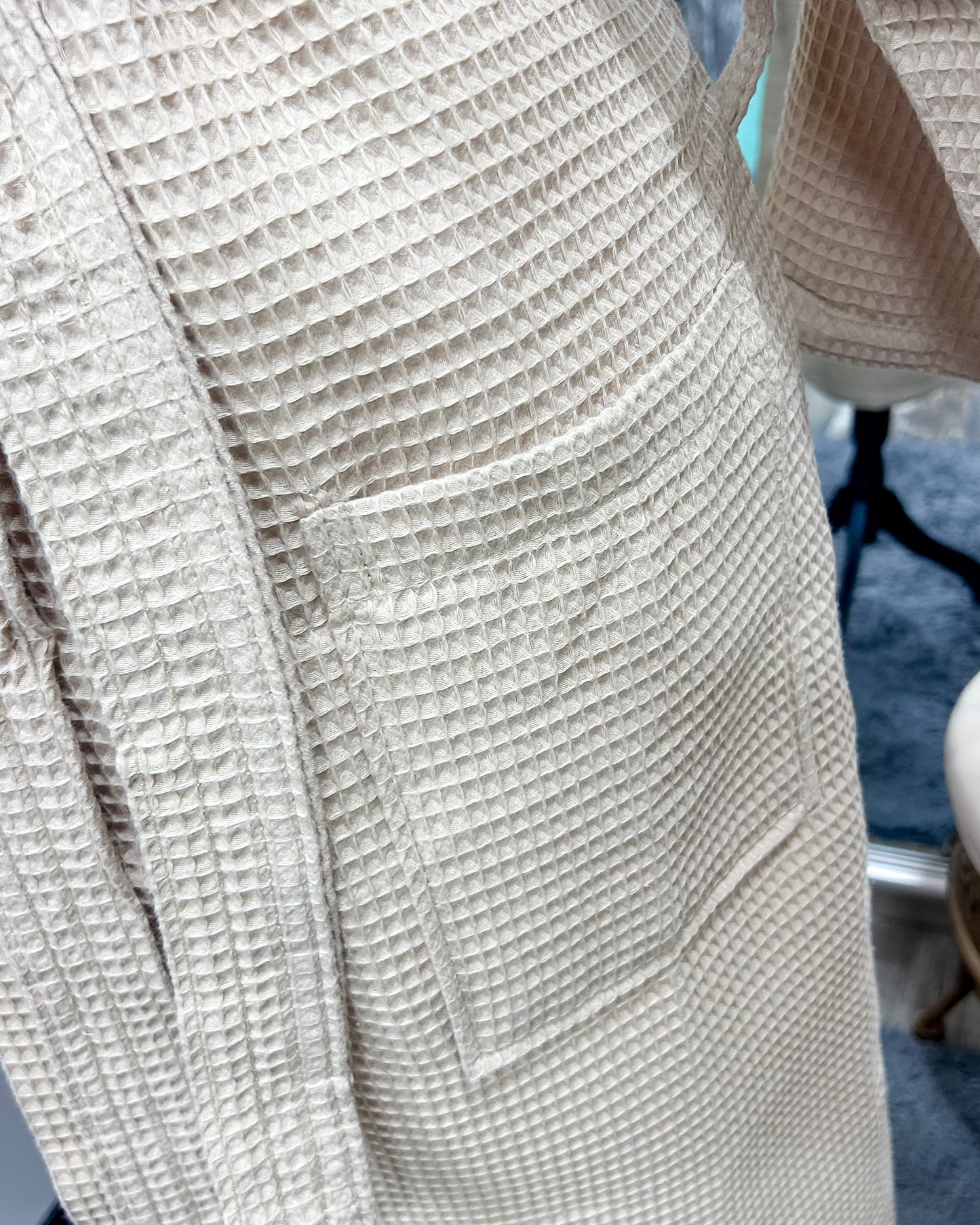 Our long waffle robe is an ideal spa, cover-up or travel robe with a unisex fit. A cotton waffle weave of 60% natural cotton and 40% polyester makes it comfortable to lounge and move freely in. Perfect to slip on after a spa treatment, sauna, or just sitting by the pool, the robe’s softness delivers the ultimate in pampering.
