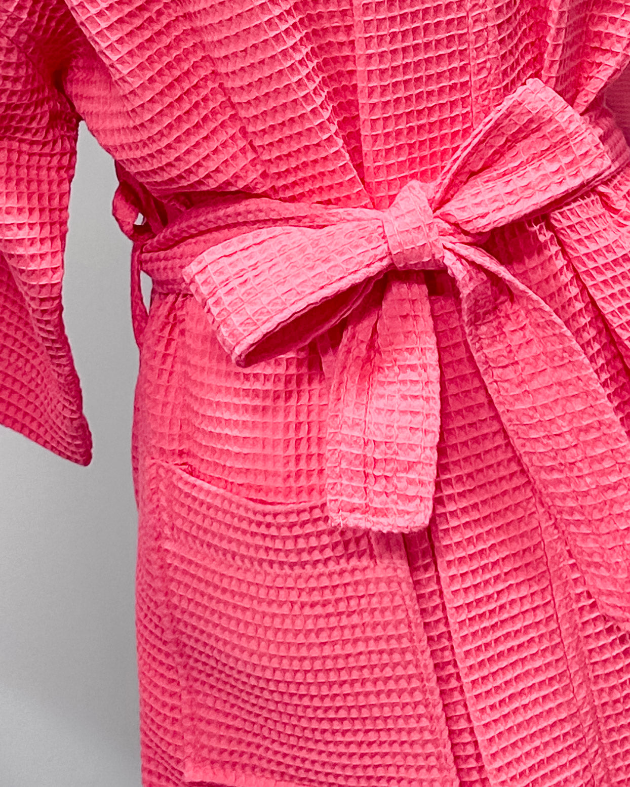 The lightweight material and durable double stitching let each waffle robe hold up after repeated washes - use it for time after time without worry. It's fabric is easy to care for: just machine wash in cool water, then tumble dry on low heat. The material dries quickly so you have it back on the hook in no time. With every wash, the robe remains absorbent and comfortable. Each long waffle robe features a self-tie wrap belt, tailored collar, plus two large pockets.