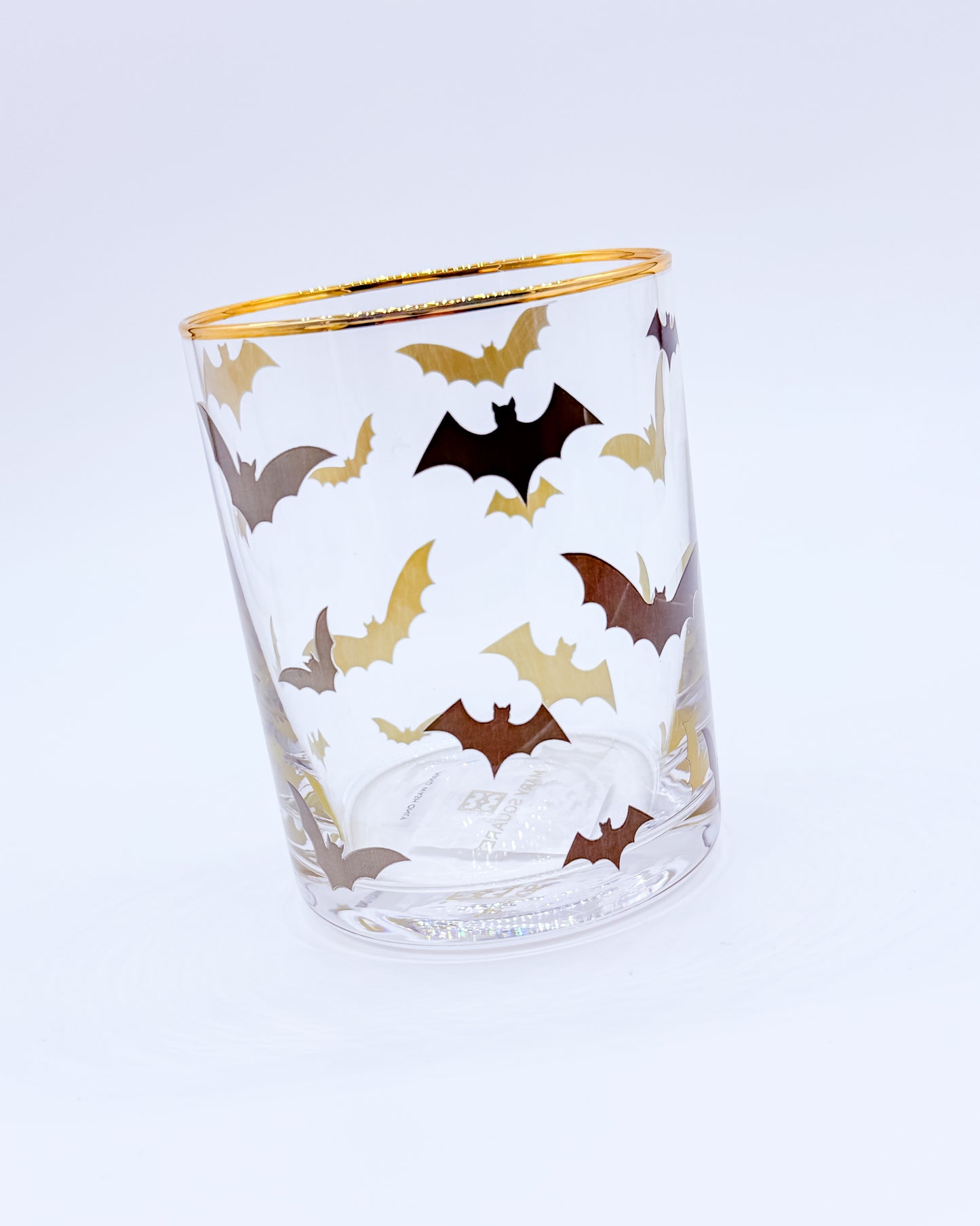 Each glass is decorated with different sized bats that are black on the outside and when looking in the glass are gold foil. The top of the glass is rimmed with a gold edge.