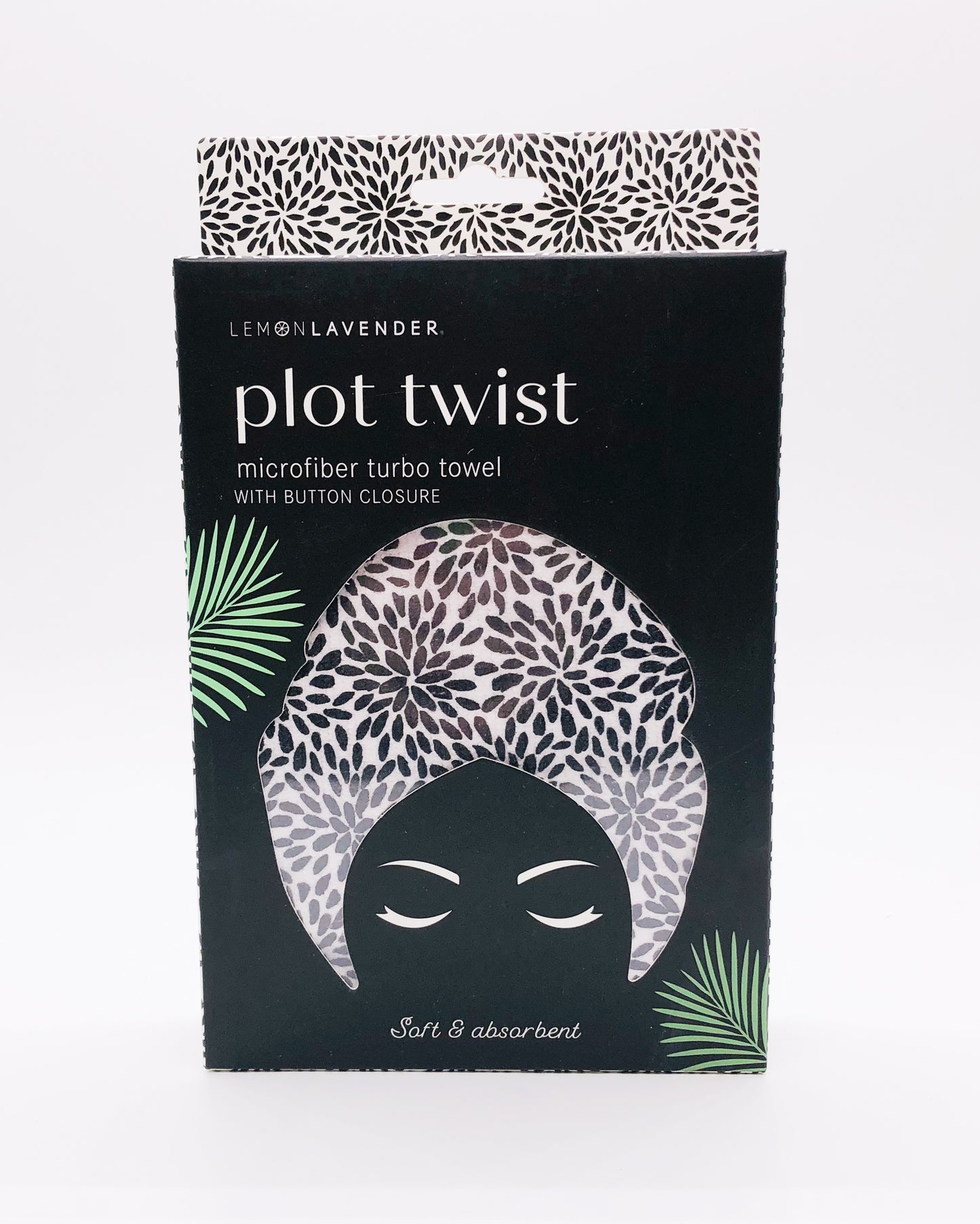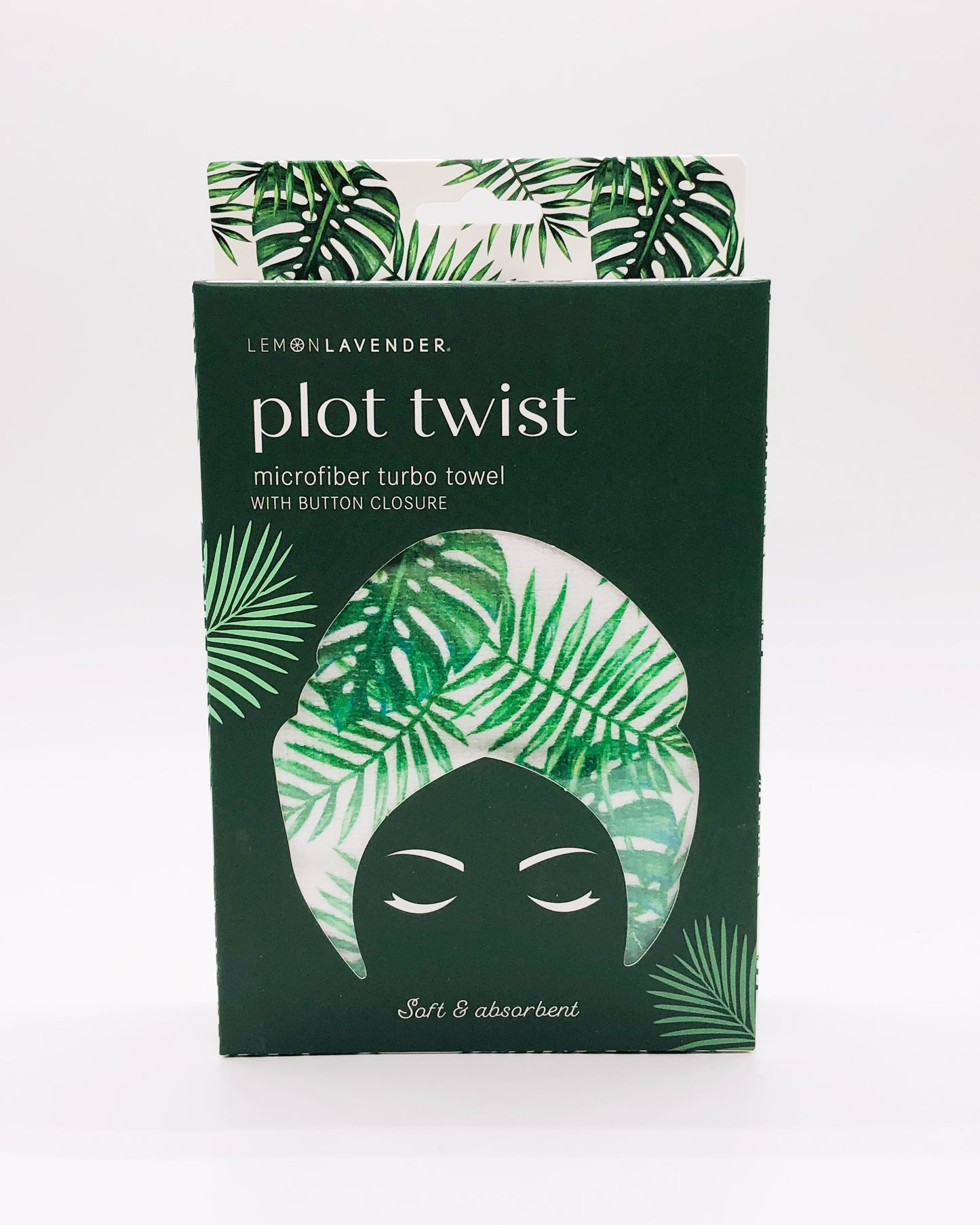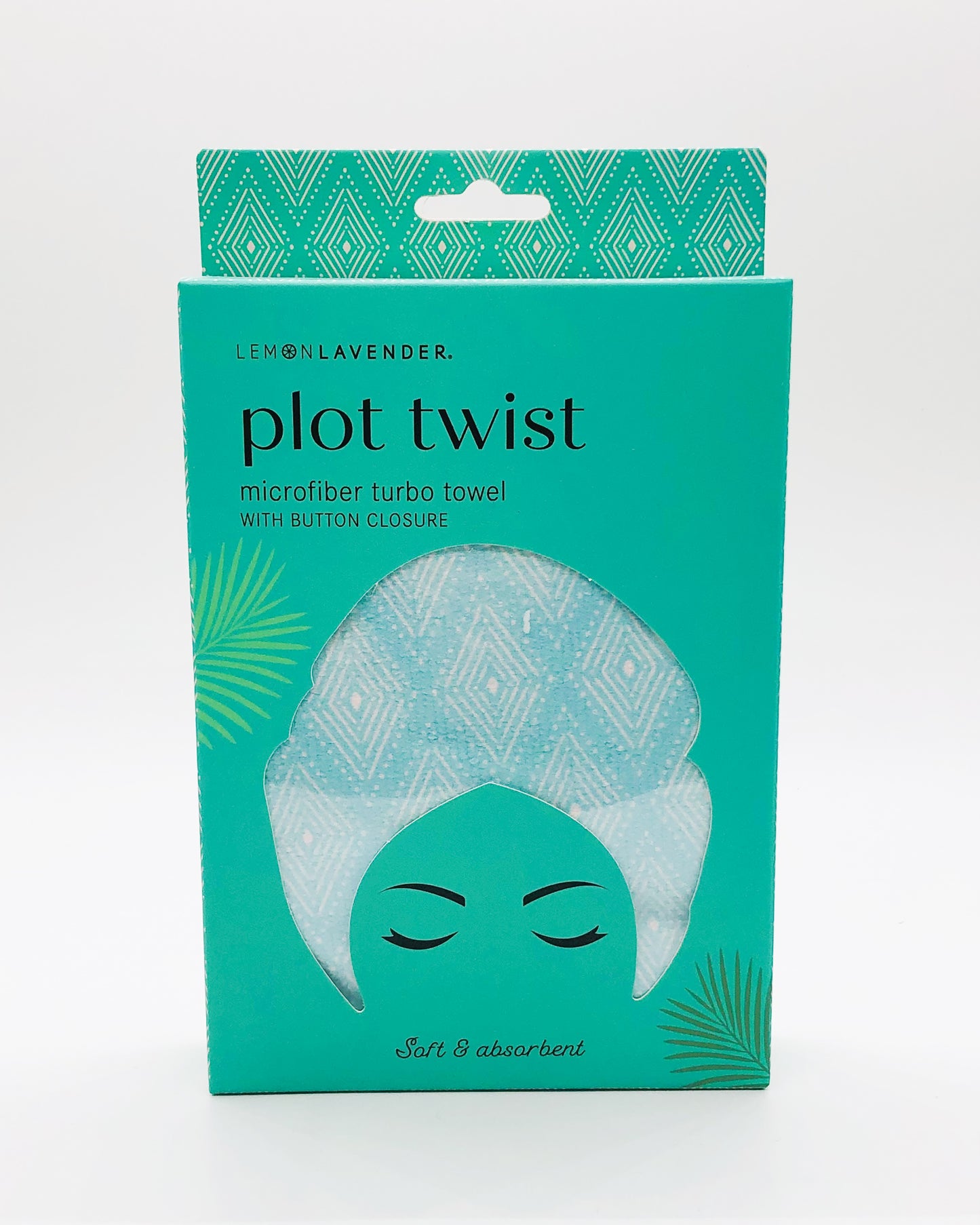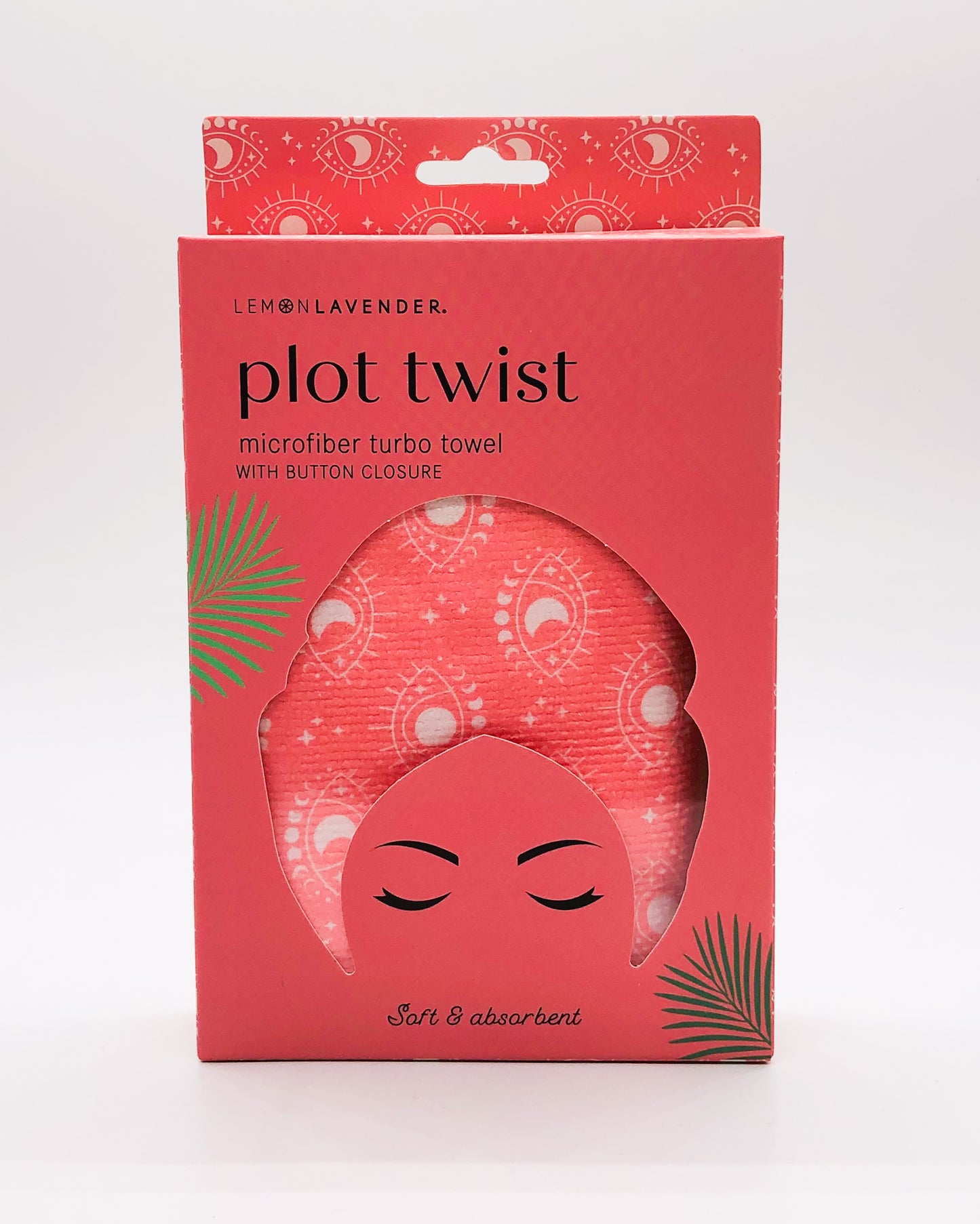 Flip your head forward so hair is pointing towards the floor. Fit the wider end of the towel over the back of your head and make sure all hair is inside. Twist the skinny end of the towel, then fold back to the nape of your neck. Secure with button and elastic loop.