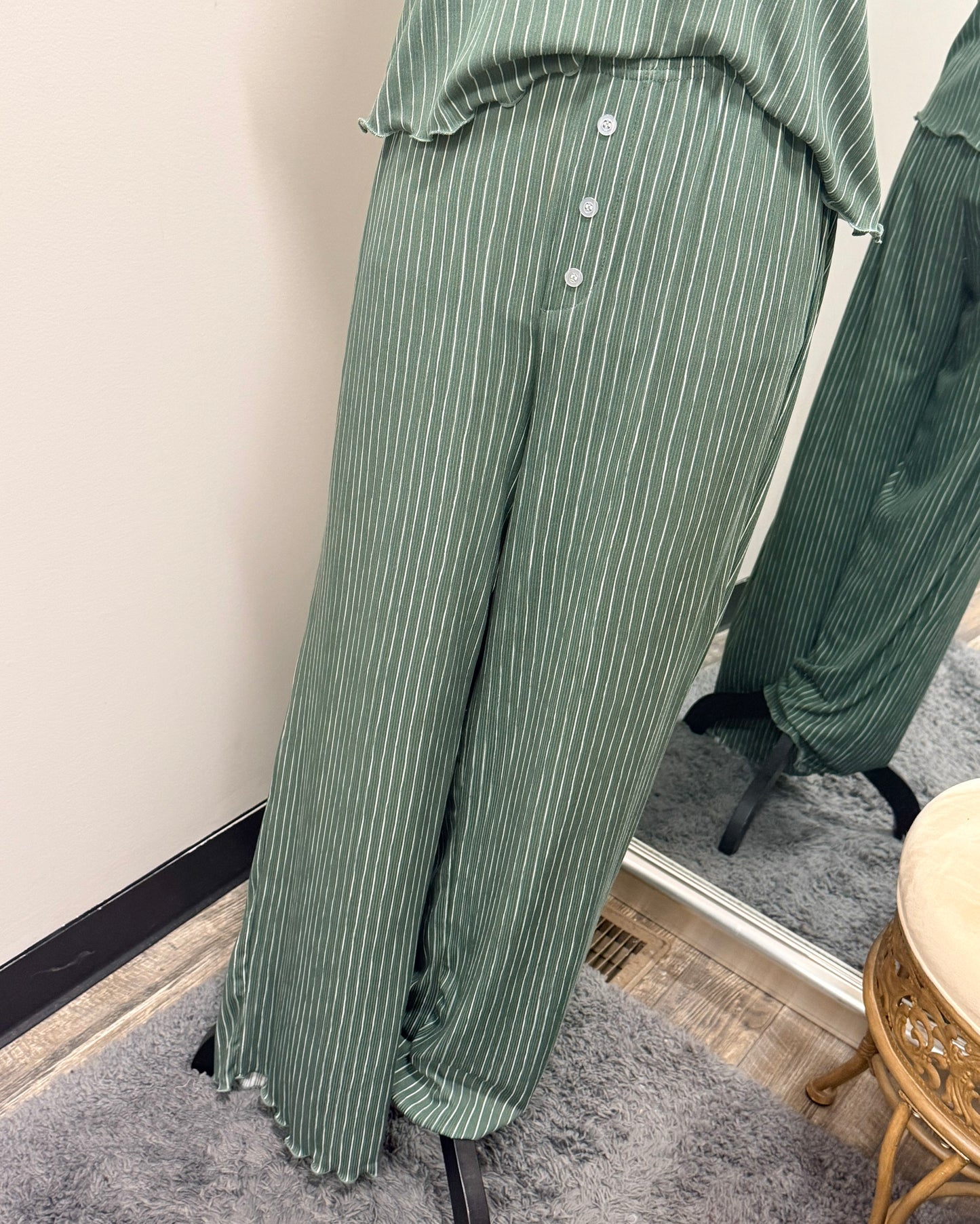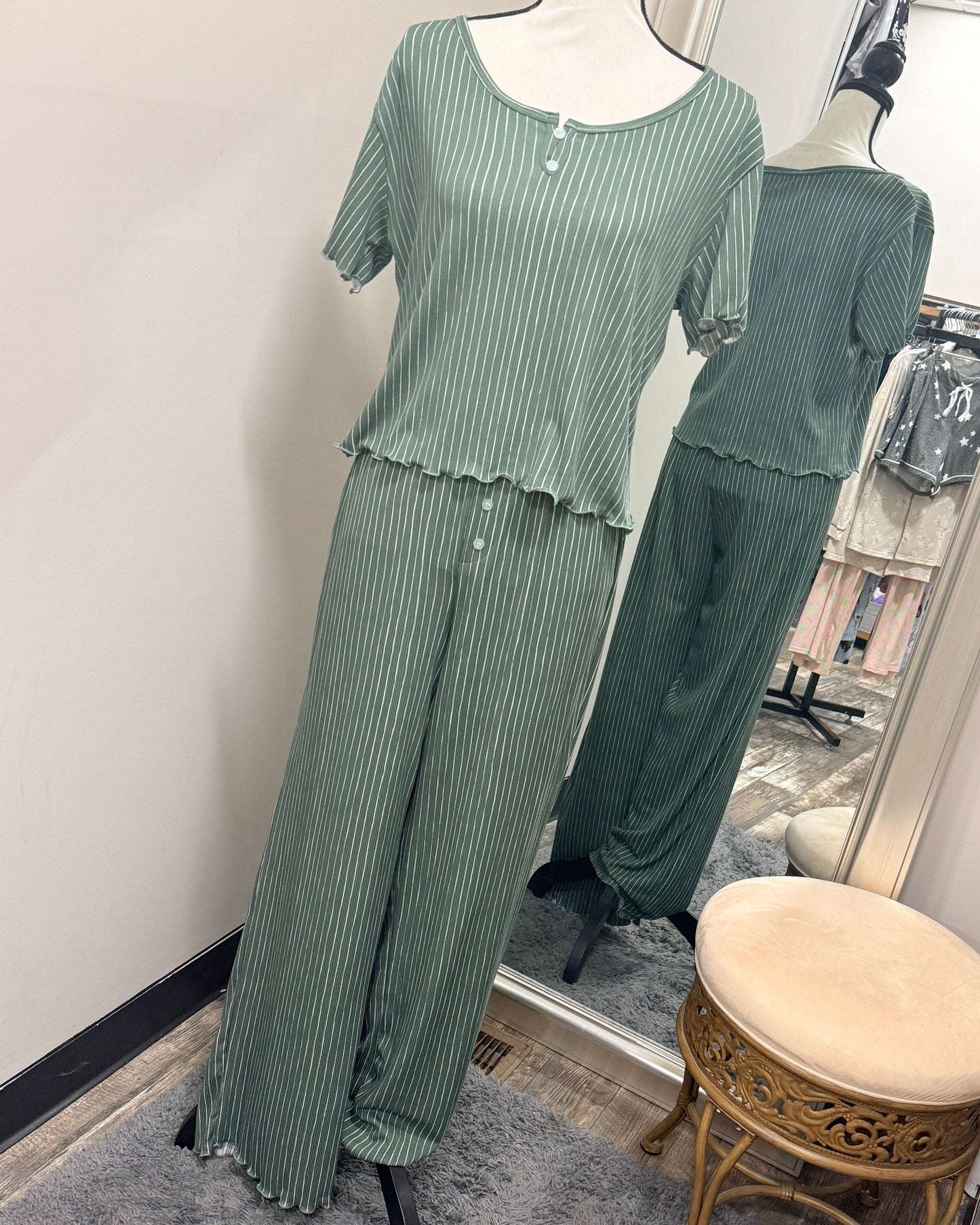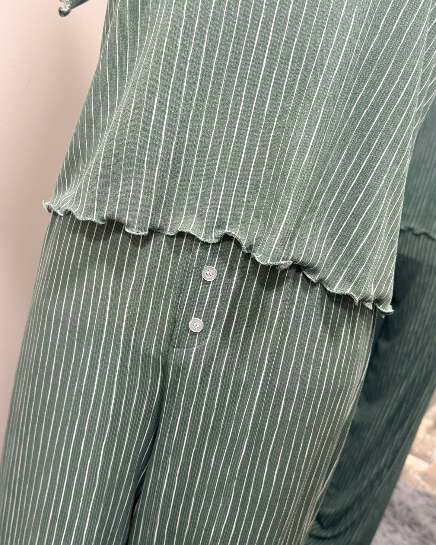 Green and white striped pajama set with ruffled hem on shirt and decorative buttons on front of pants on a neutral background