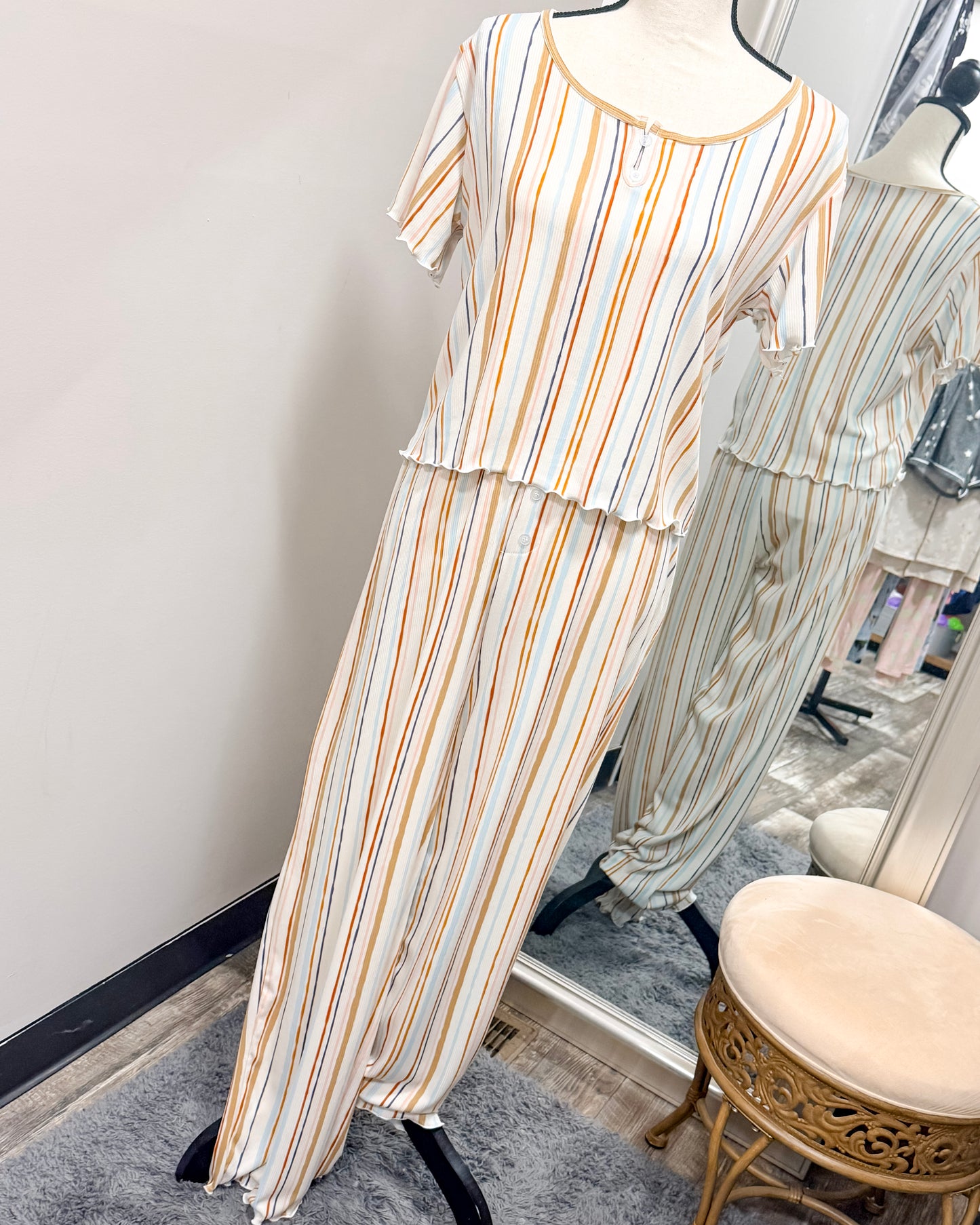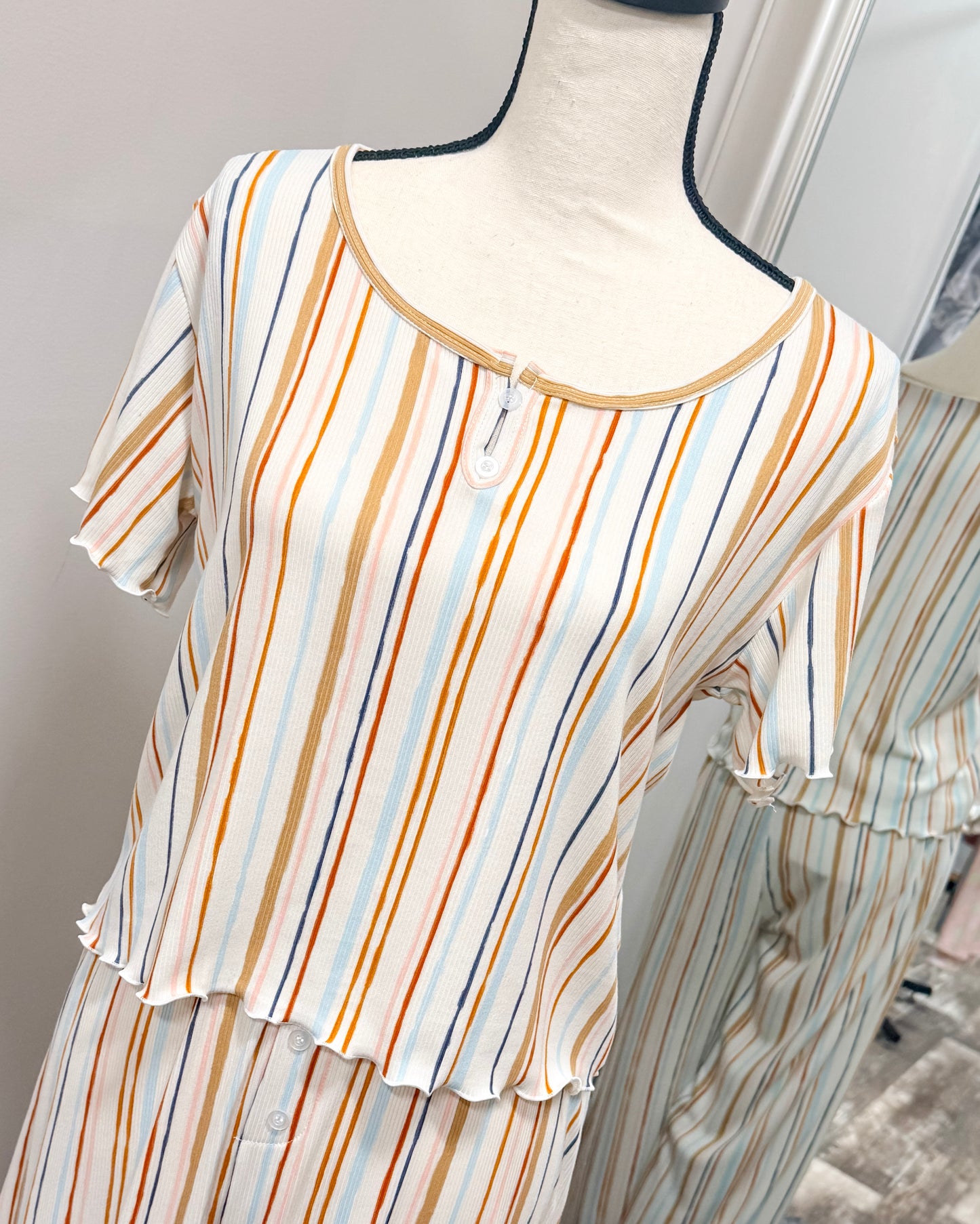 Multi-colored striped pajama set on a mannequin against a neutral background