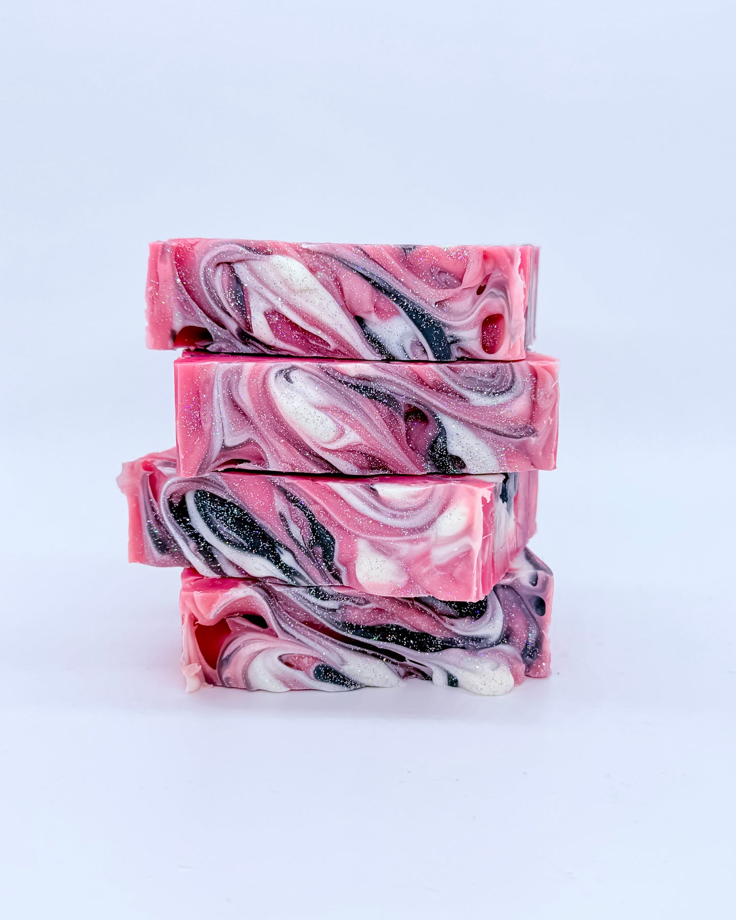 Made with Water, Sweet Almond Oil, Coconut Oil, Shea Butter, Avacado Oil, Sodium Hydroxide, Palm Kernel Oil, Sunflower Oil, Castor Oil, Fragrance and/or Essential Oils and colorant.
