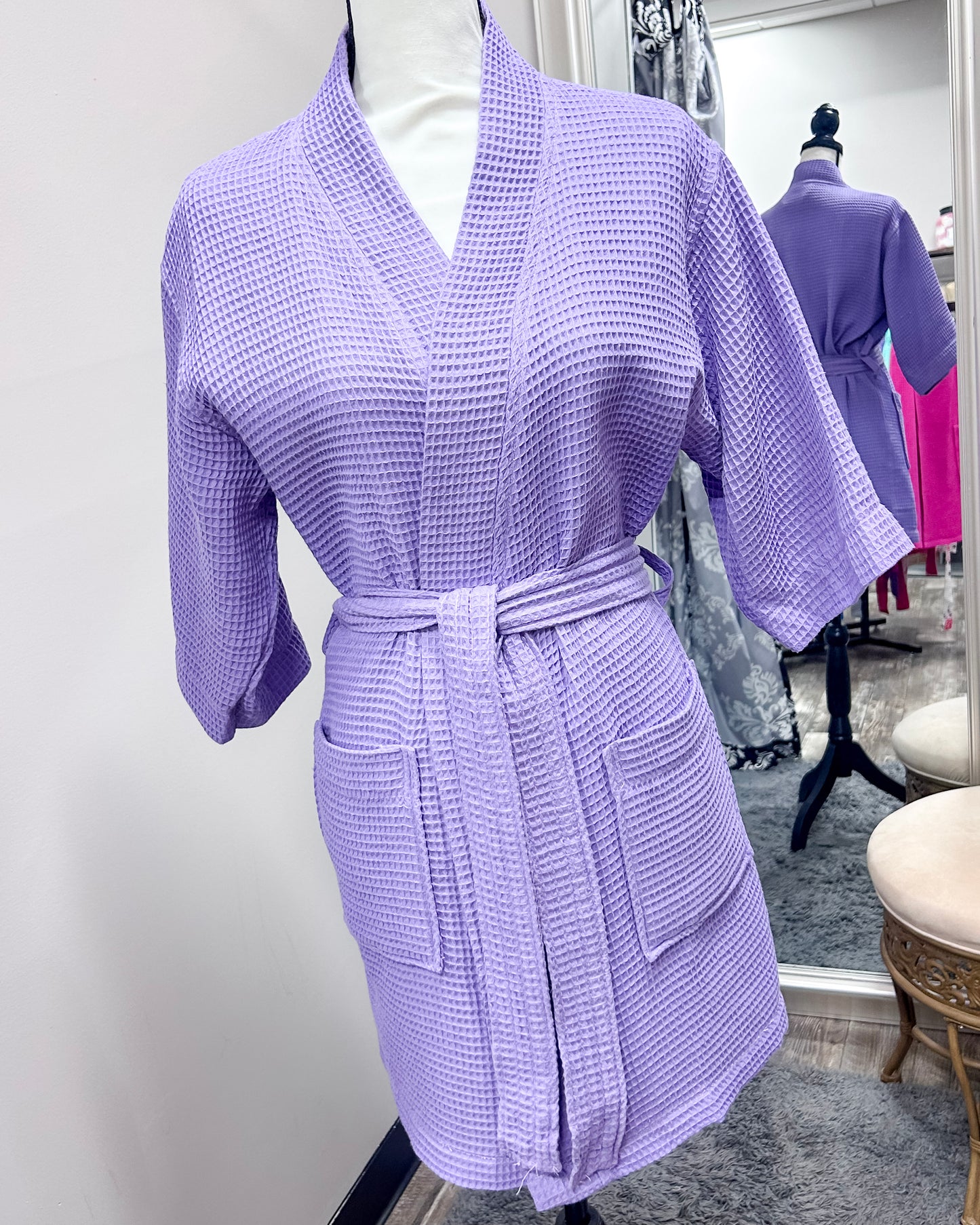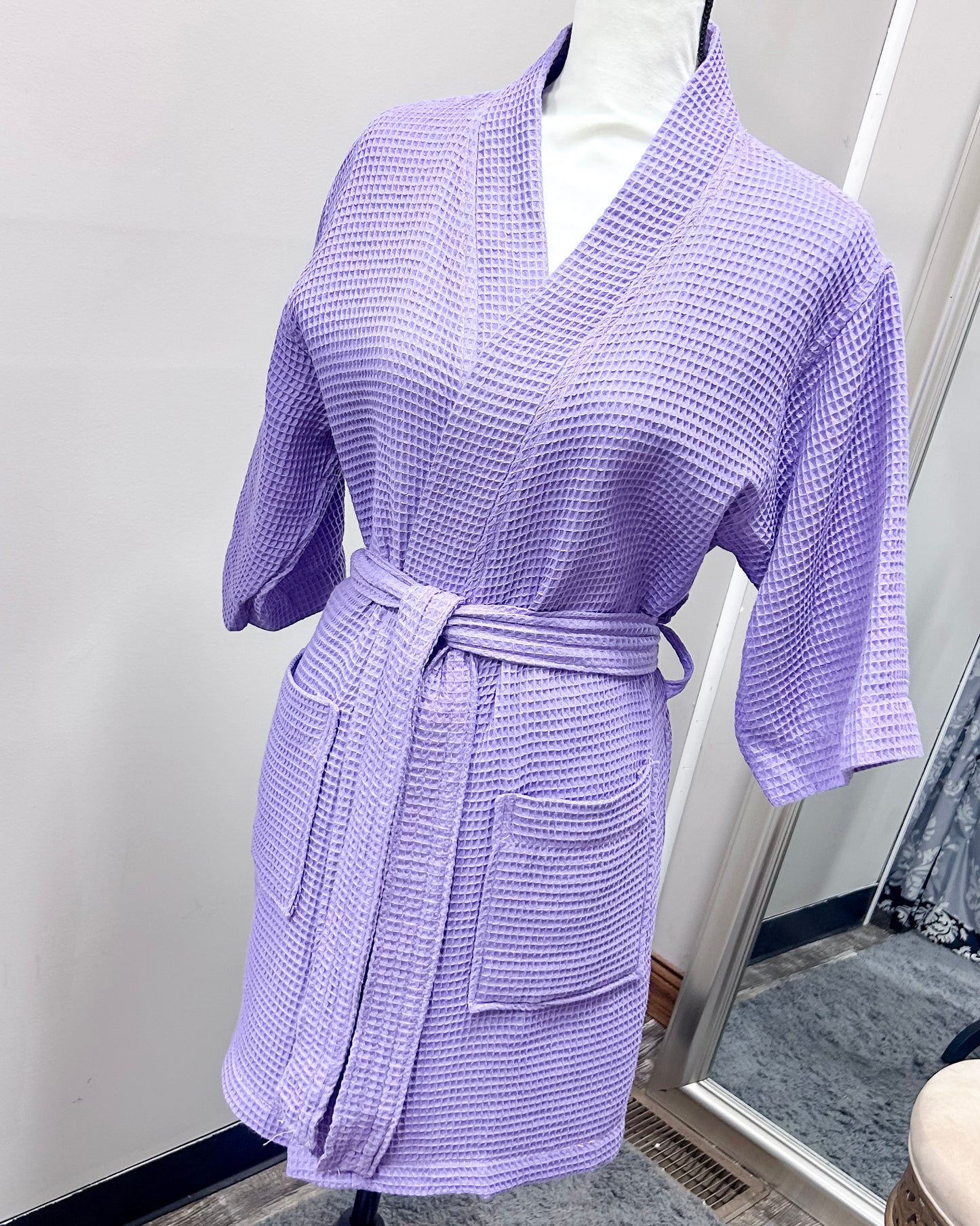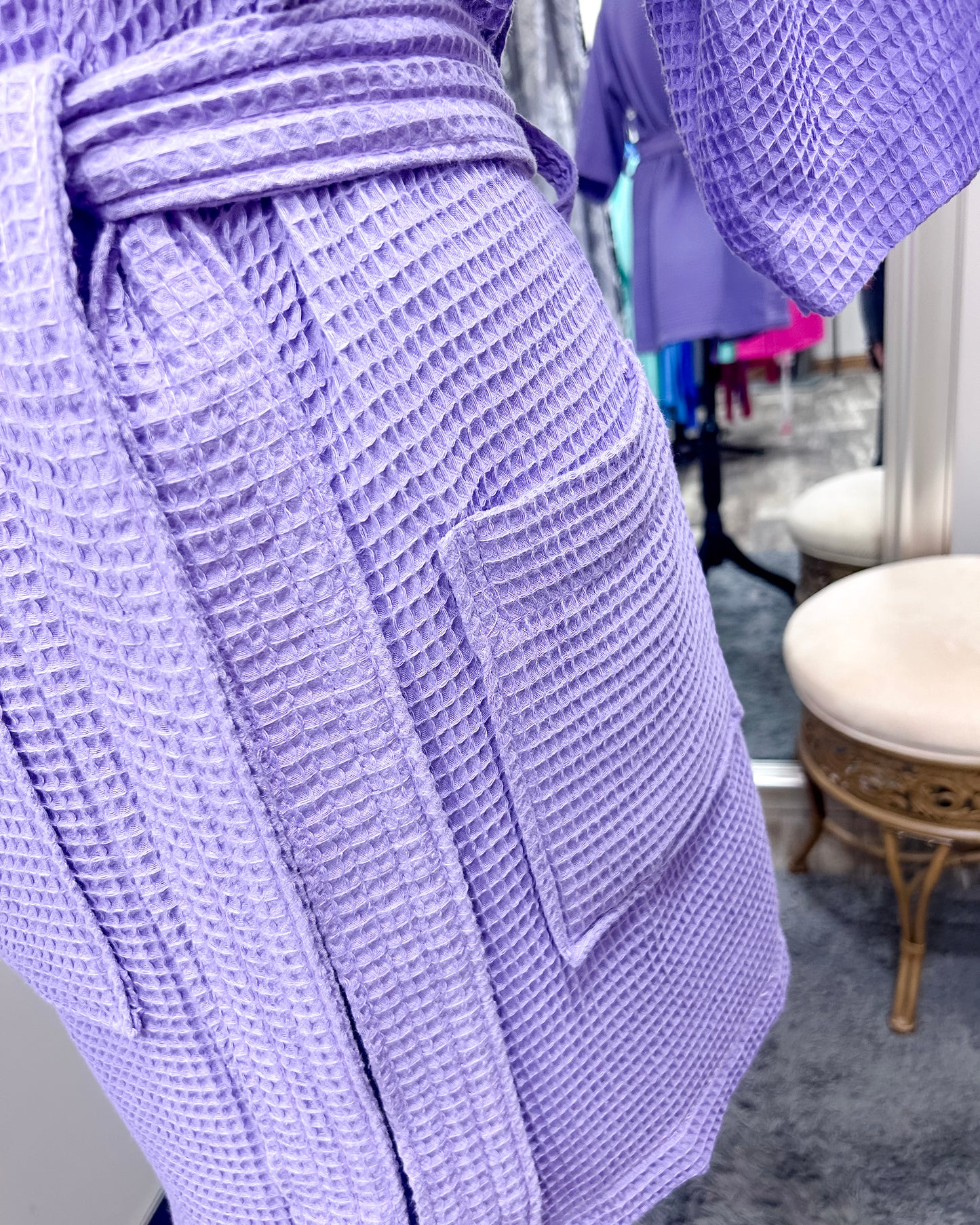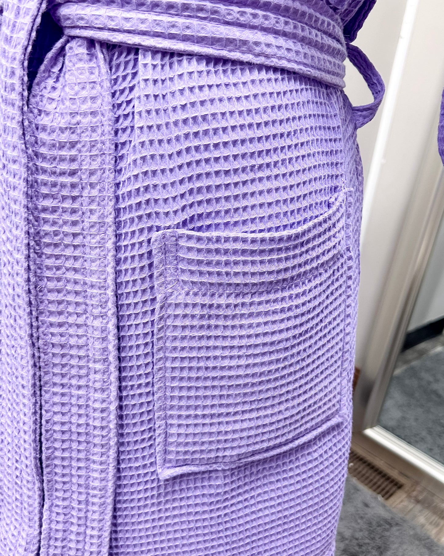 The lightweight material and durable double stitching let each waffle robe hold up after repeated washes - use it for time after time without worry. It's fabric is easy to care for: just machine wash in cool water, then tumble dry on low heat. The material dries quickly so you have it back on the hook in no time. With every wash, the robe remains absorbent and comfortable. Each long waffle robe features a self-tie wrap belt, tailored collar, plus two large pockets.