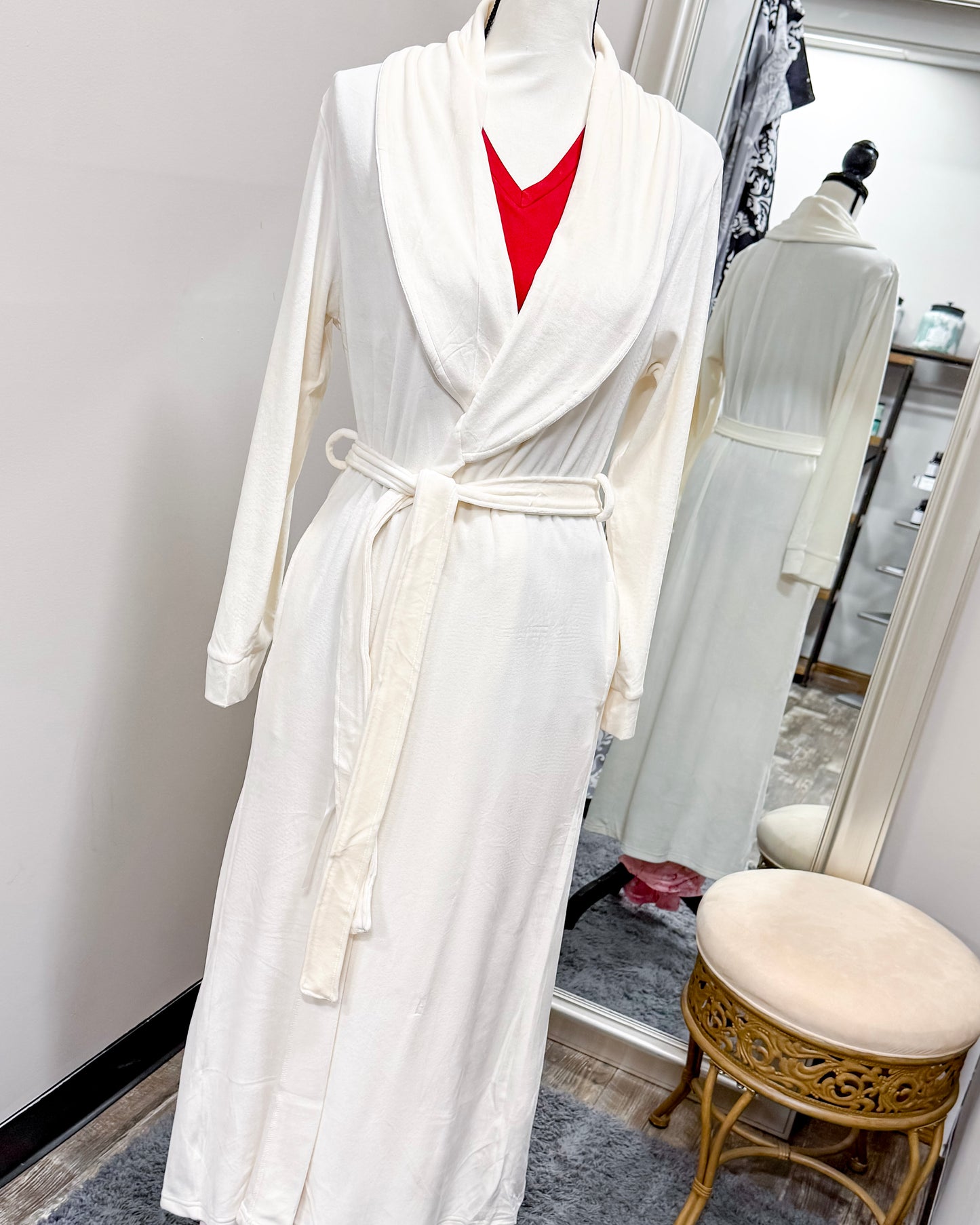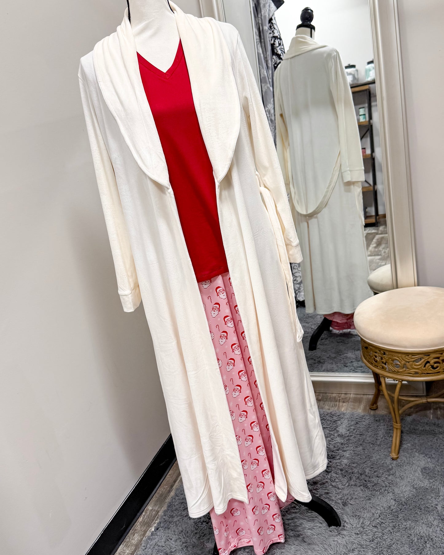 This classic style robe is perfect for the holidays or all year round! It's a lighter weight then terry robes but heavier that a spa waffle robe. Yet it somehow is super soft and cozy and warm! Features a removable belt for easy cover up, pockets for storing all the things, and cuffed sleeves which we love to keep them out of way when needed!
