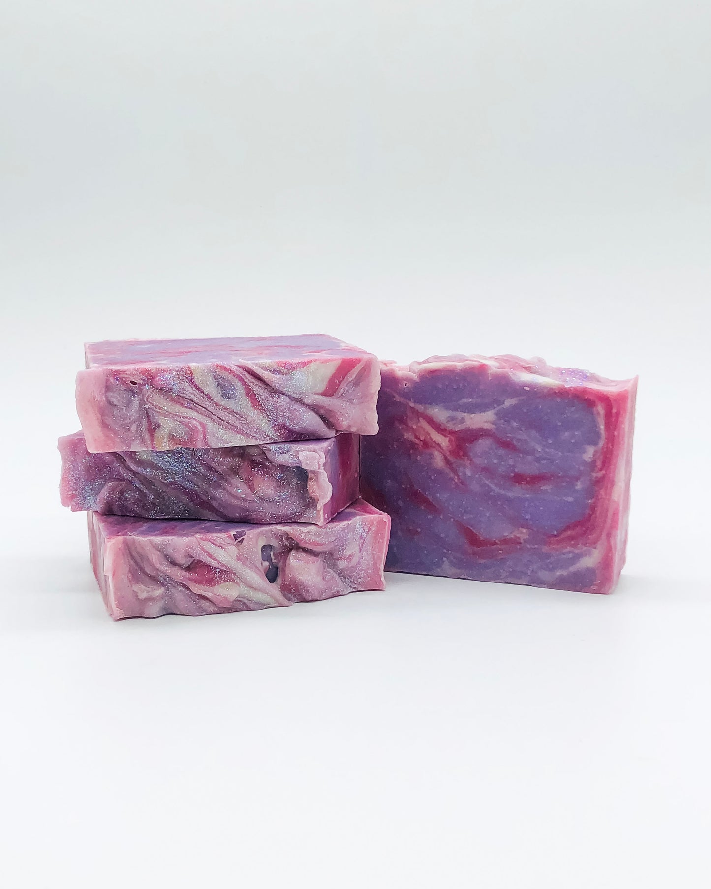 Made with Water, Sweet Almond Oil, Coconut Oil, Shea Butter, Avacado Oil, Sodium Hydroxide, Palm Kernel Oil, Sunflower Oil, Castor Oil, Fragrance and/or Essential Oils and colorant.