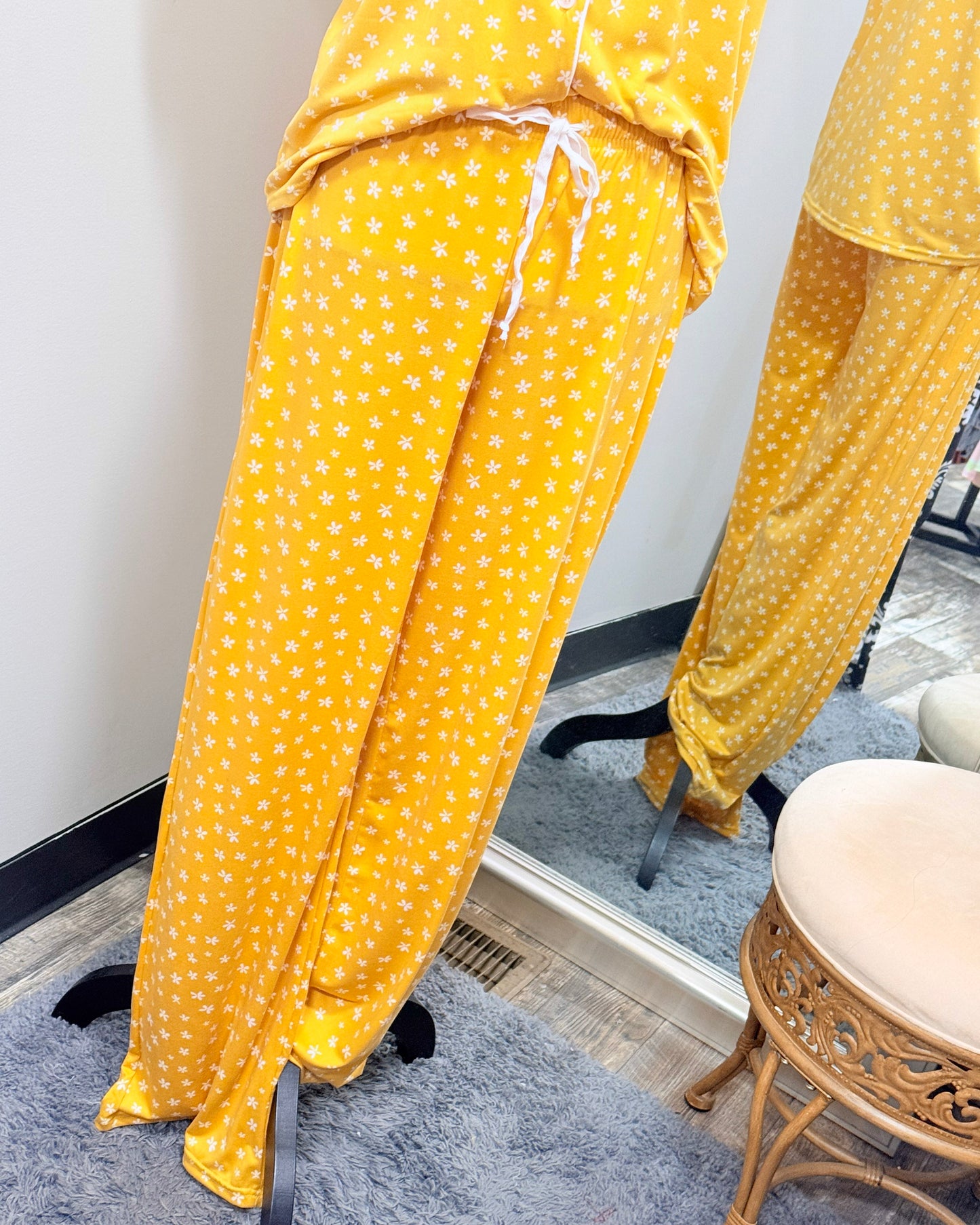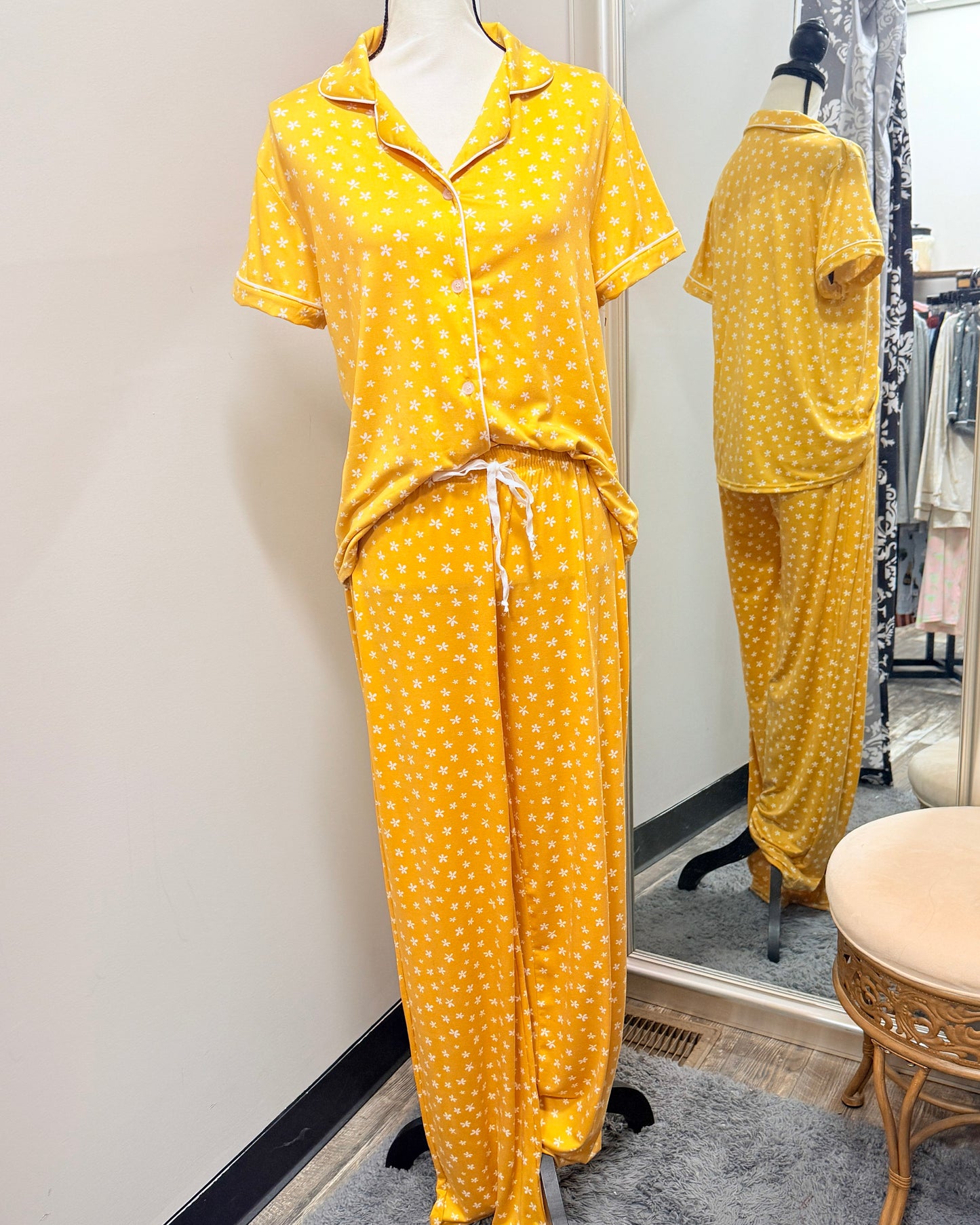 Yellow pajama set with small while flower pattern on a mannequin in front of a mirror.