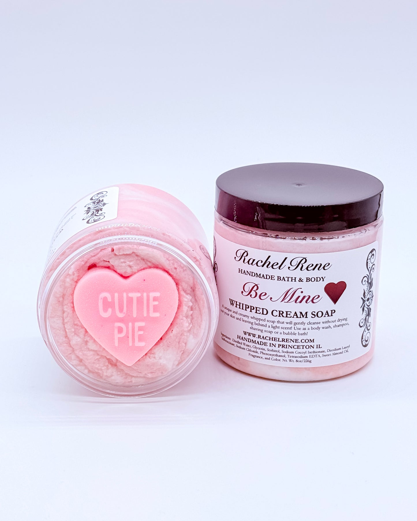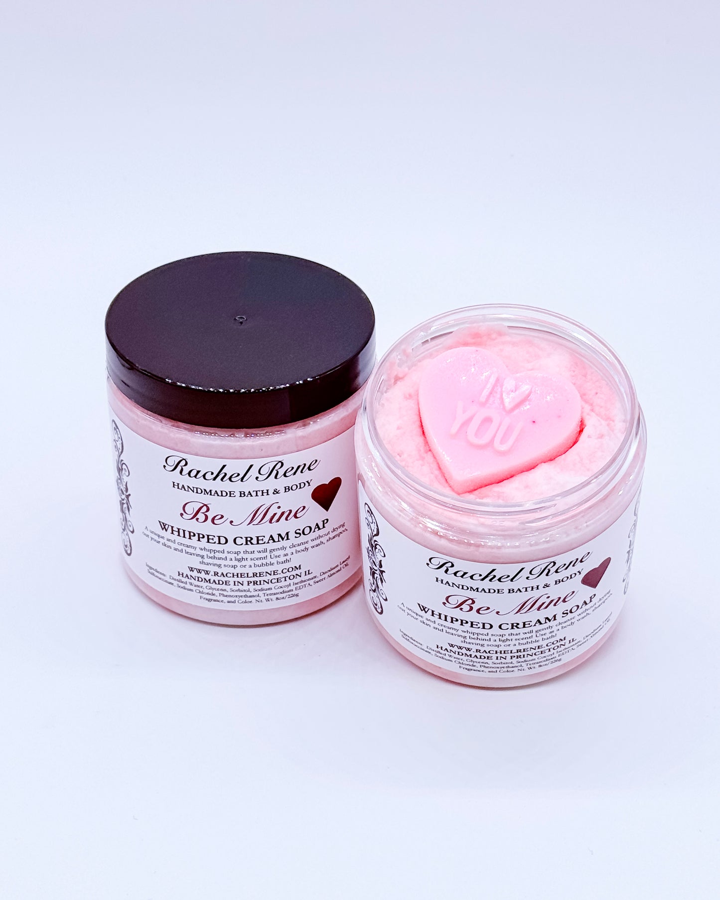 Two jars of Rachel Rene whipped cream soap label on a white background Be Mine .