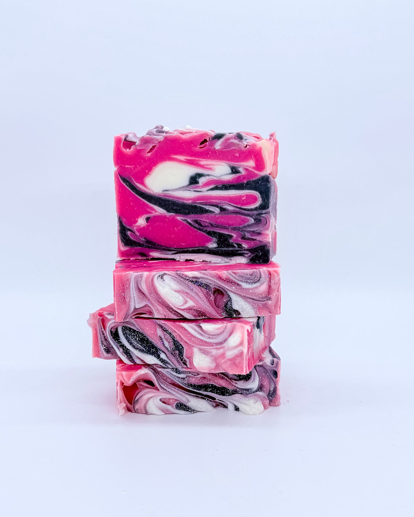 Made with Water, Sweet Almond Oil, Coconut Oil, Shea Butter, Avacado Oil, Sodium Hydroxide, Palm Kernel Oil, Sunflower Oil, Castor Oil, Fragrance and/or Essential Oils and colorant.