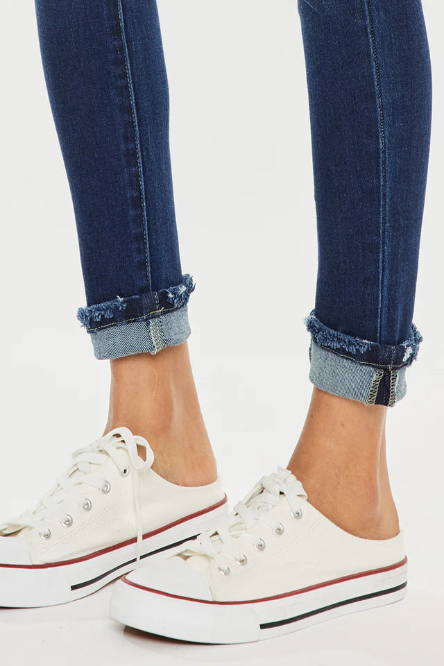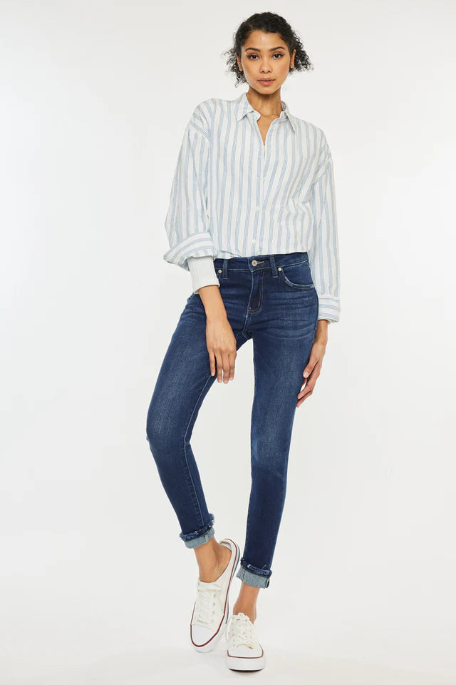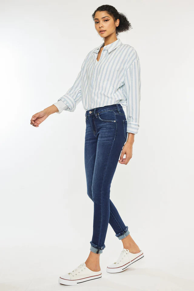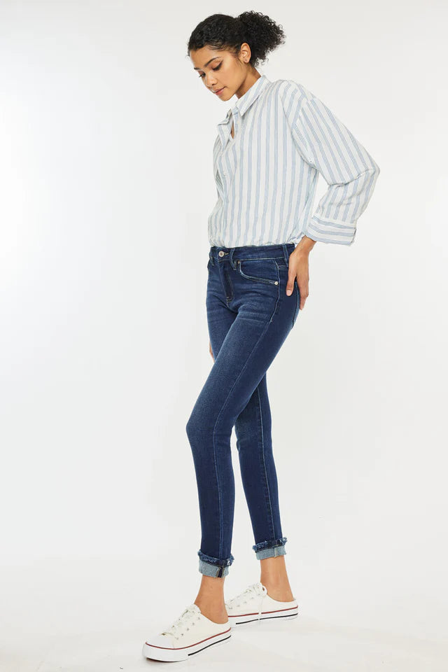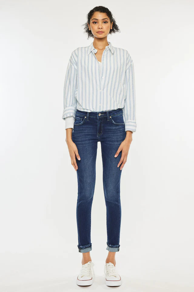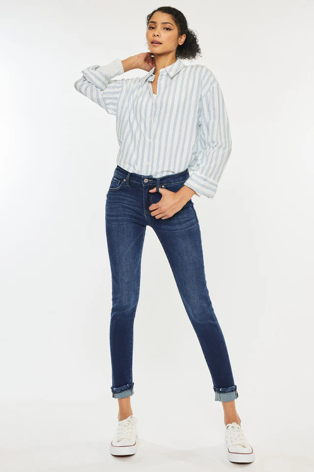 Regular price $20.00Our Kennedy Mid Rise Jeans come in an ankle skinny cut in a faded medium wash Features whiskering on the medium and dark wash. This ankle skinny comes with a folded raw hem that can be worn uncuffed if preferred. Sits right at the natural waistline as it tapers down the leg creating a stylish and fun fit. Made with soft, stretch denim that's flexible and breathable. Features a classic five-pocket design, single-button front, and zip-fly closure.