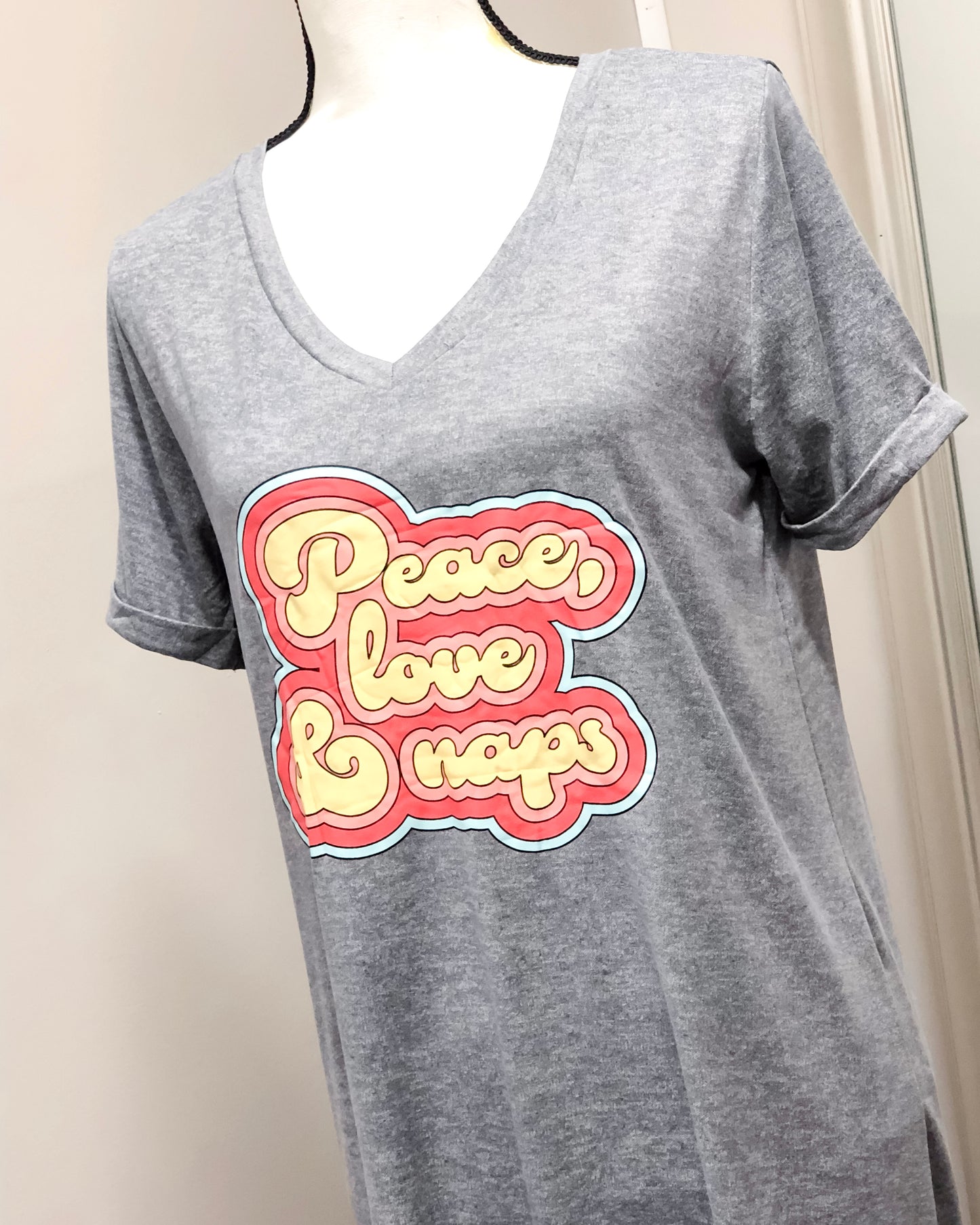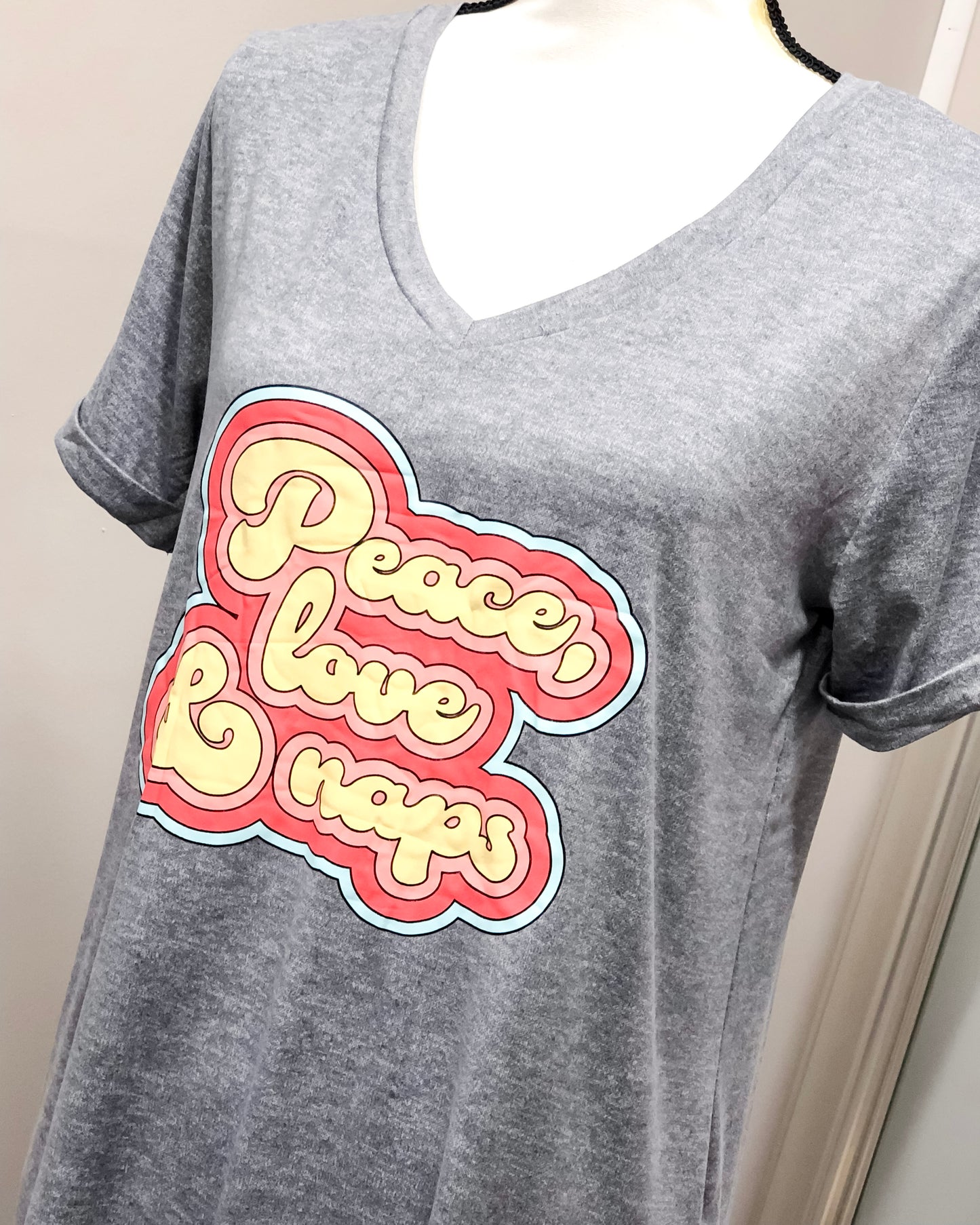 Peace, Love & Naps is the perfect sleep shirt saying because we all know that naps are happiness right?