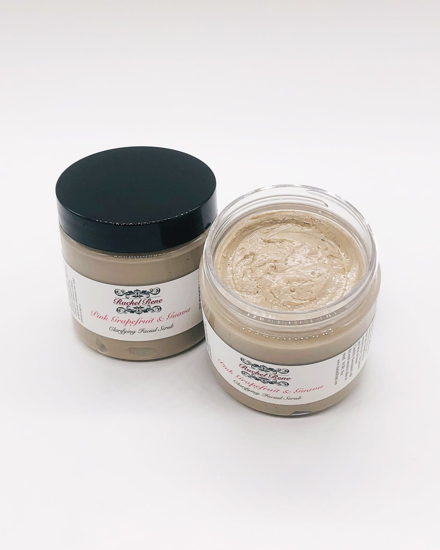 This all-natural facial scrub contains Kaolin clay, a fluffy clay extremely *rich* in nutrients and minerals. It feeds your skin and helps to keep the nose from looking shiny, too! You will also find grapeseed oil, Vitamin E and guava extract; a potent fruit-based antioxidant that rejuvenates dull skin, leaving your complexion SUPER smooth and glowing! Guava is very rich in Vitamins, helping prevent oxidation of cells and giving this scrub an anti-aging property. It also contains grapefruit essential oil, which is an excellent astringent oil with a fresh citrus scent.