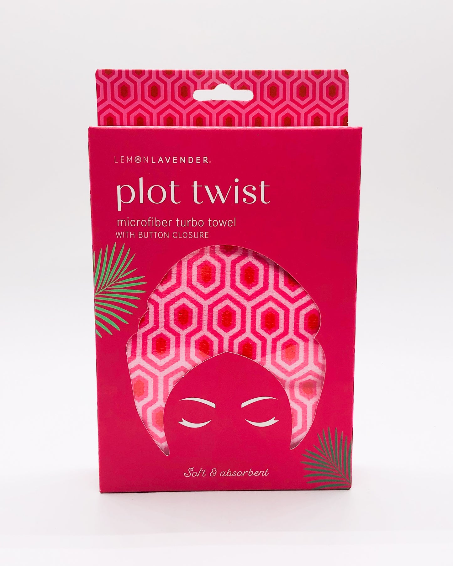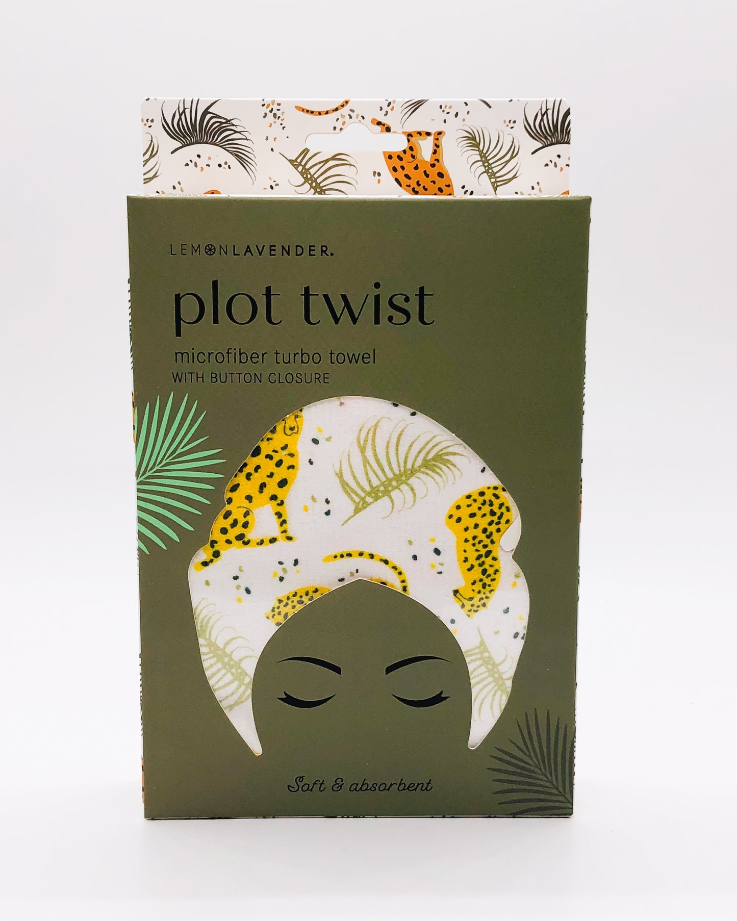Flip your head forward so hair is pointing towards the floor. Fit the wider end of the towel over the back of your head and make sure all hair is inside. Twist the skinny end of the towel, then fold back to the nape of your neck. Secure with button and elastic loop.