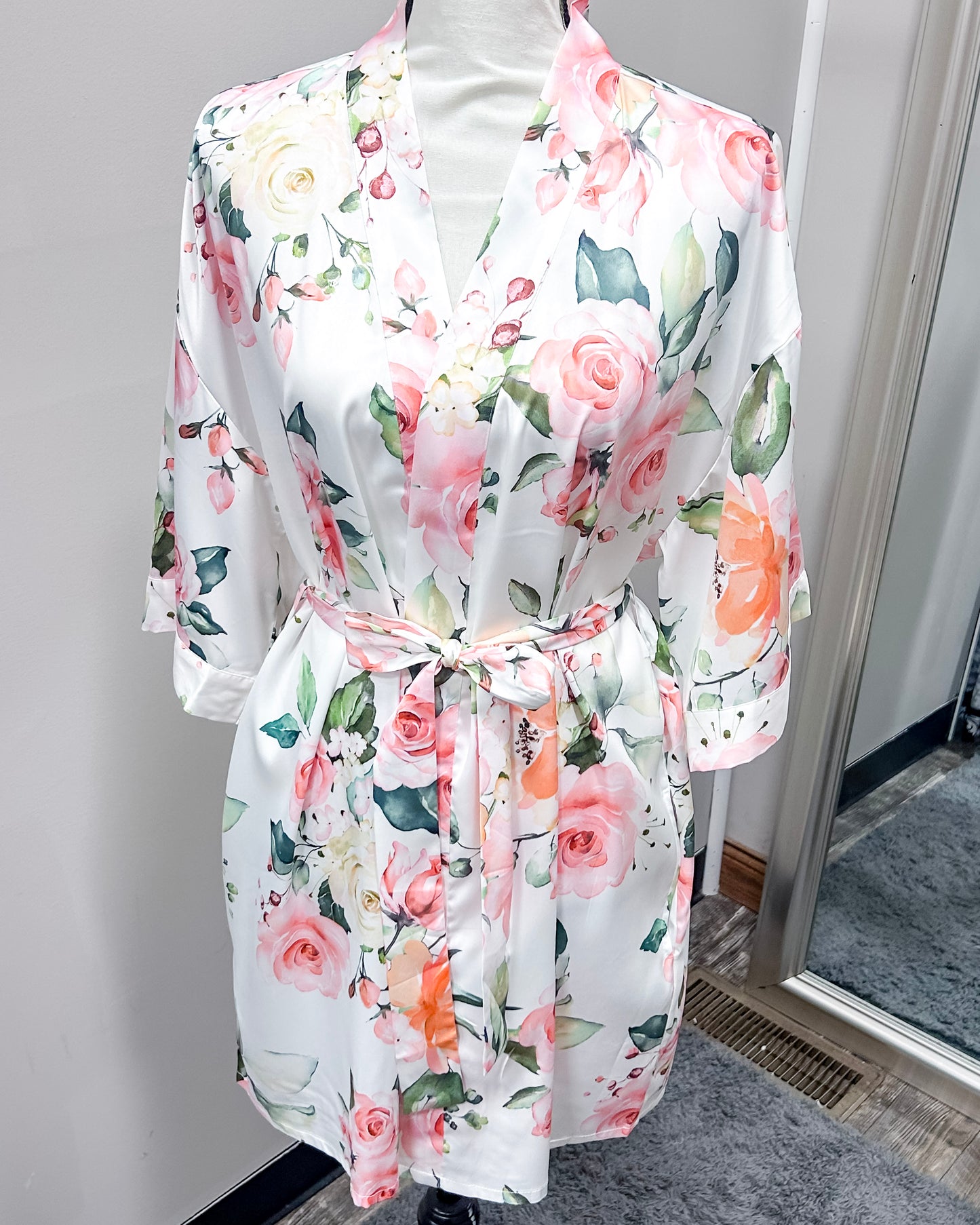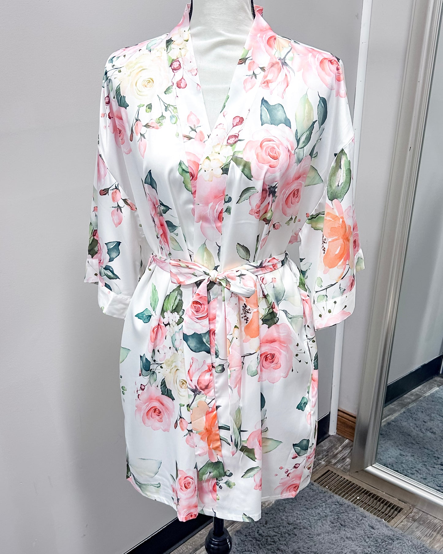 Our robe’s premium 95% Polyester, 5% Spandex fabric is a perfect combination for durability and low maintenance. Care instructions are easy, as you can machine wash the robe in cold water then tumble dry on low. Every time it’s washed, the robe keeps its soft, silky luxury. A short satin robe in kimono style, each garment features a tailored collar, self-tie wrap belt, an inside tie and a pocket.