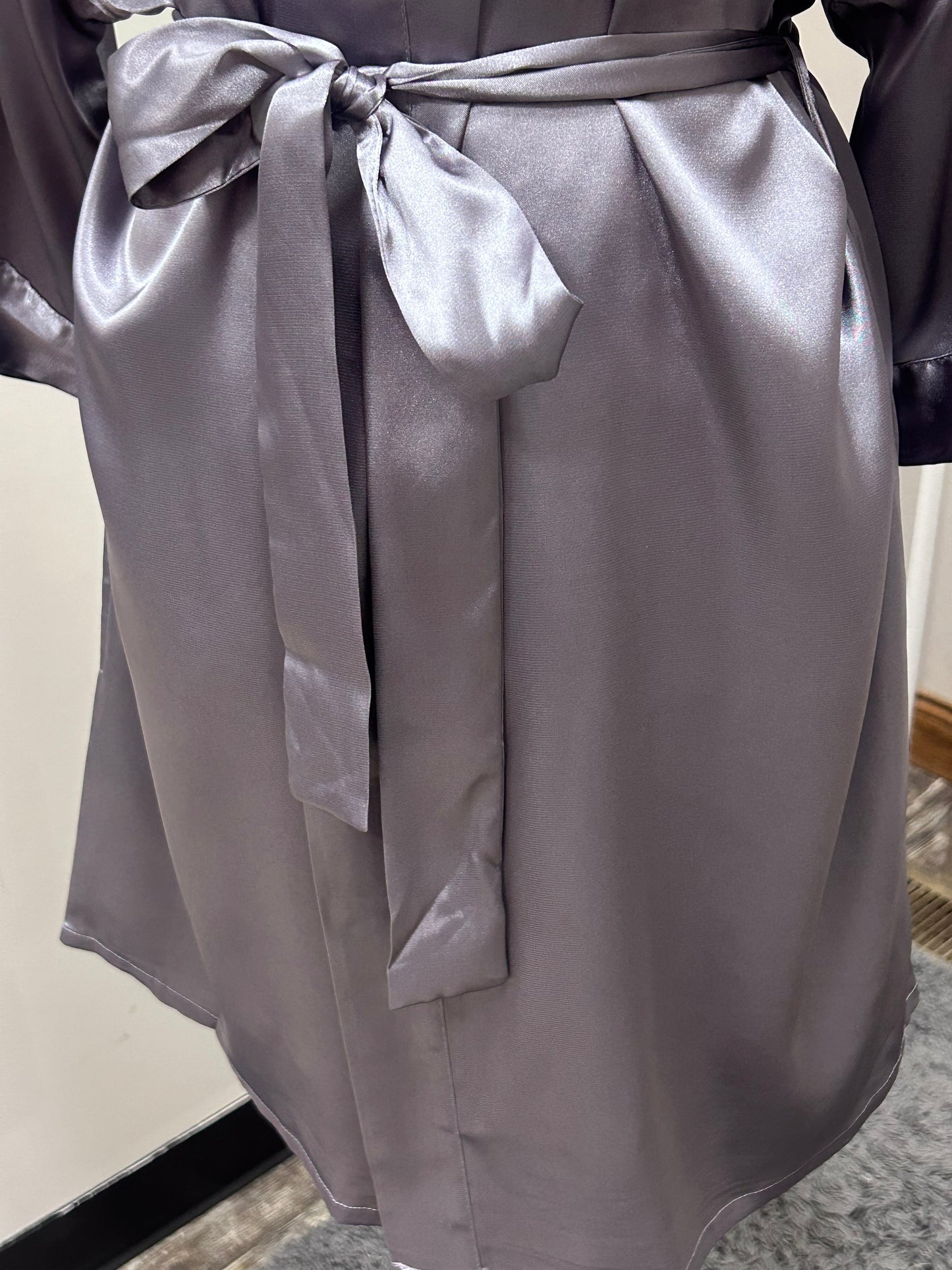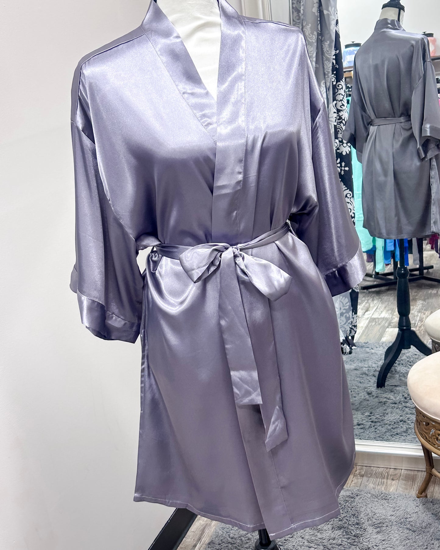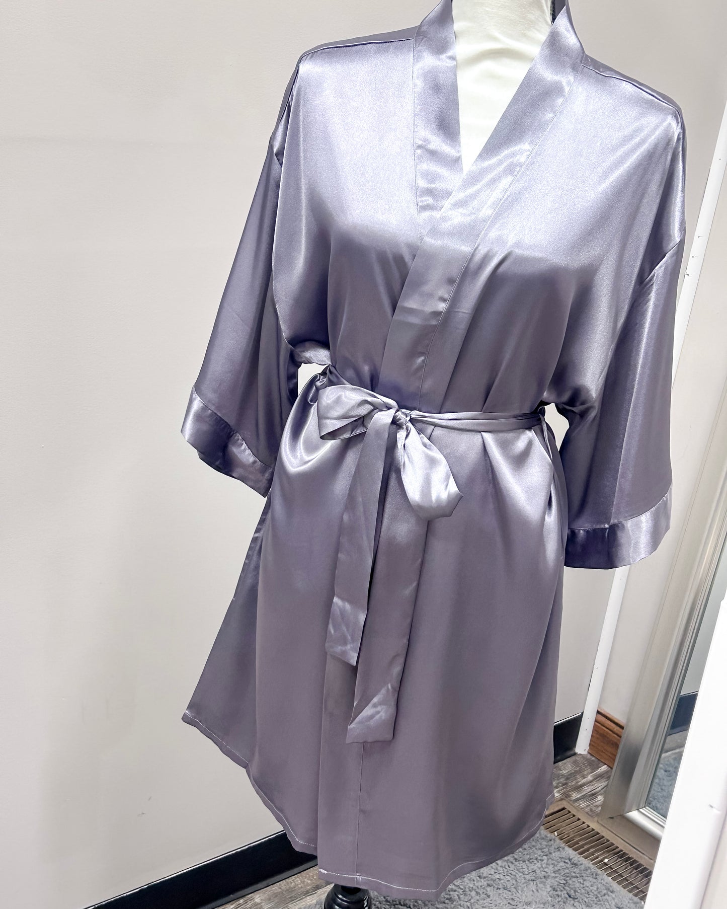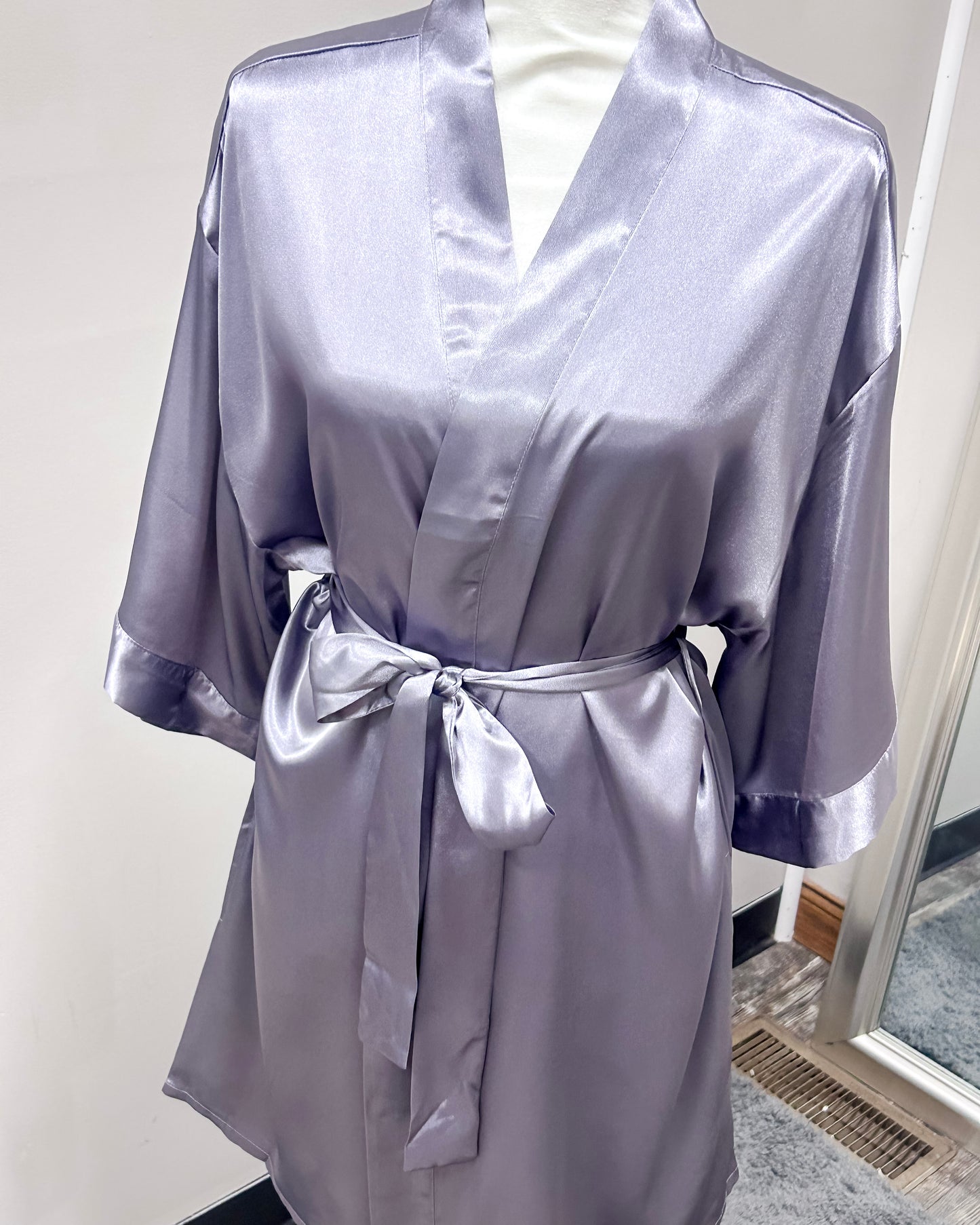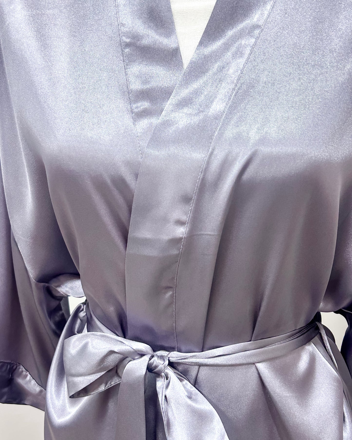 Our robe’s premium 95% Polyester, 5% Spandex fabric is a perfect combination for durability and low maintenance. Care instructions are easy, as you can machine wash the robe in cold water then tumble dry on low. Every time it’s washed, the robe keeps its soft, silky luxury. A short satin robe in kimono style, each garment features a tailored collar, self-tie wrap belt, an inside tie and a pocket.