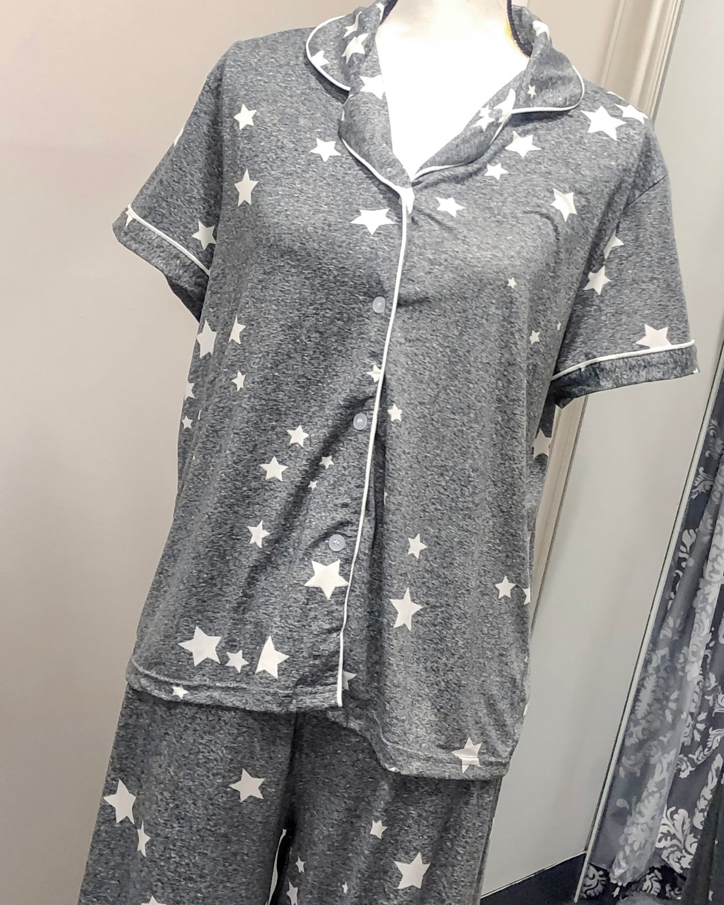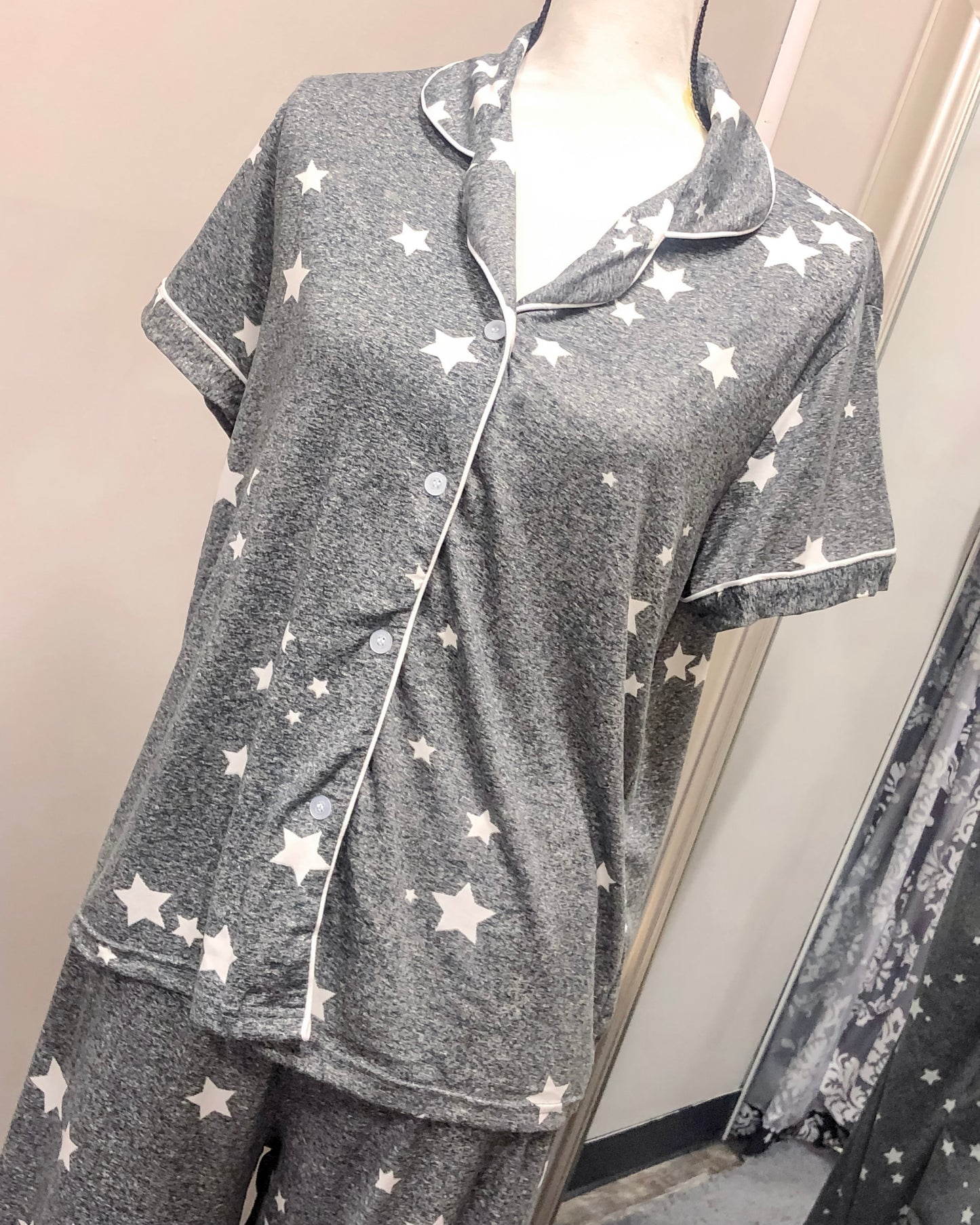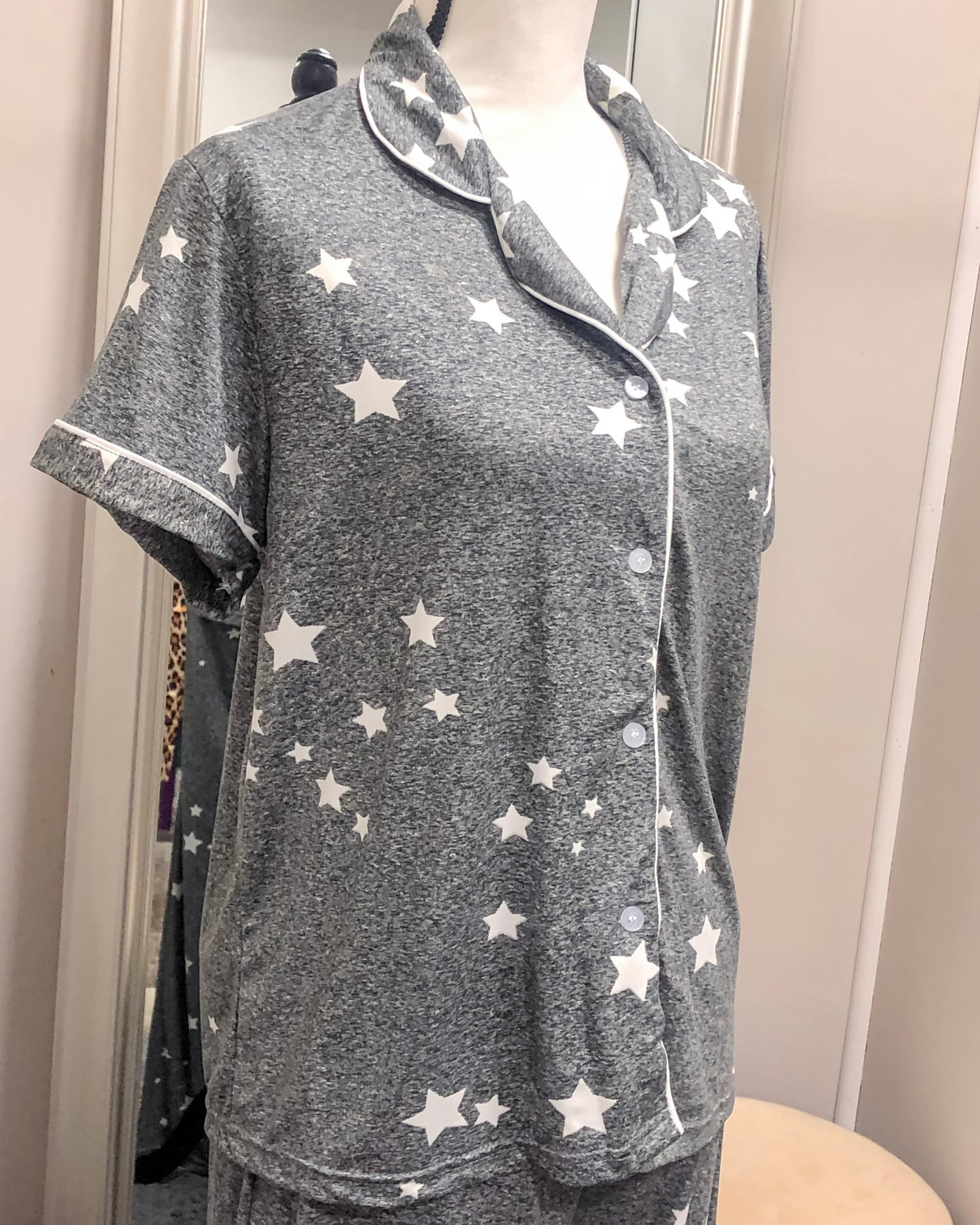 The perfect PJ top for lazy mornings, comfy days and cozy nights. This classic button-down top features wide short sleeves, subtle piping and a beautiful print.