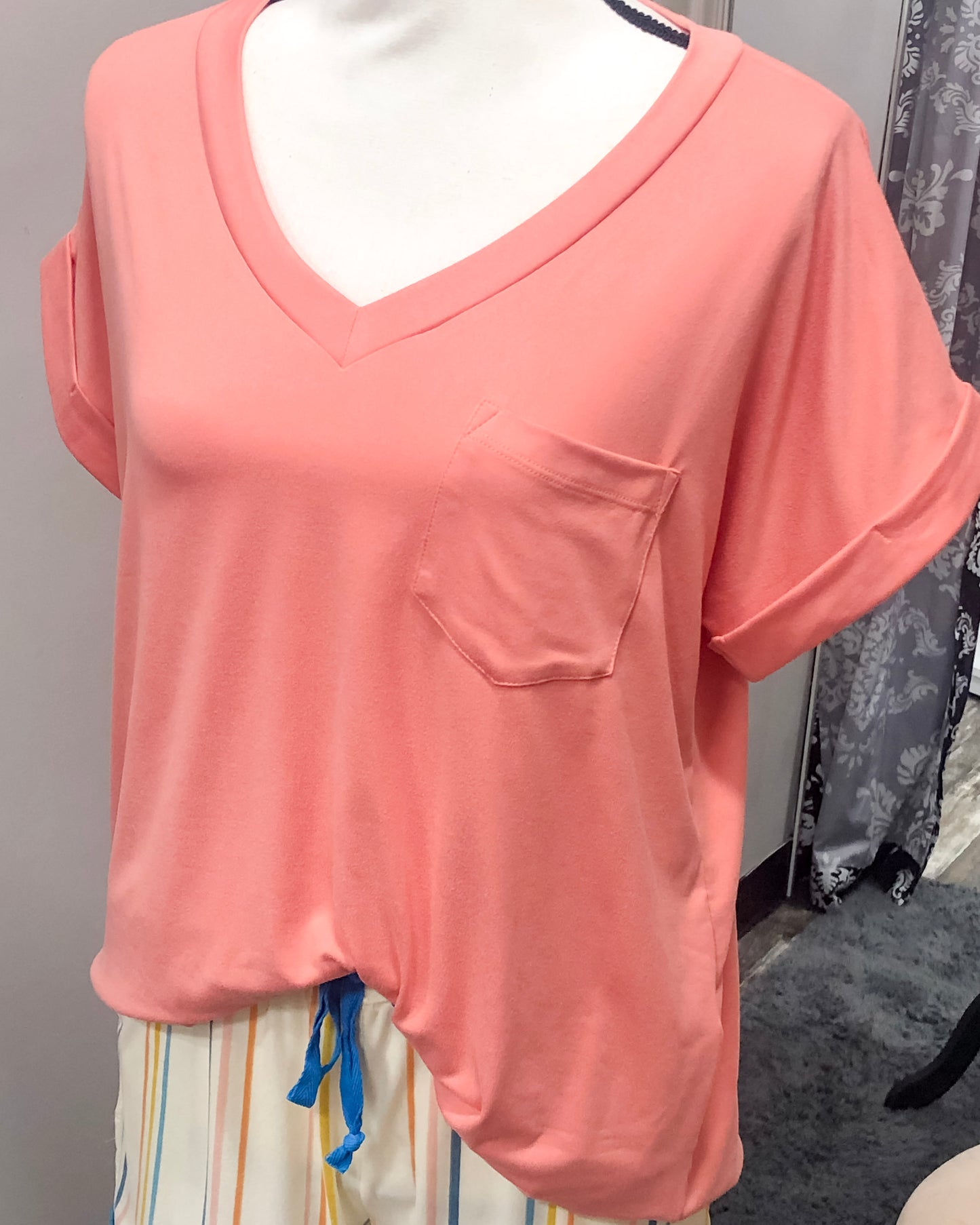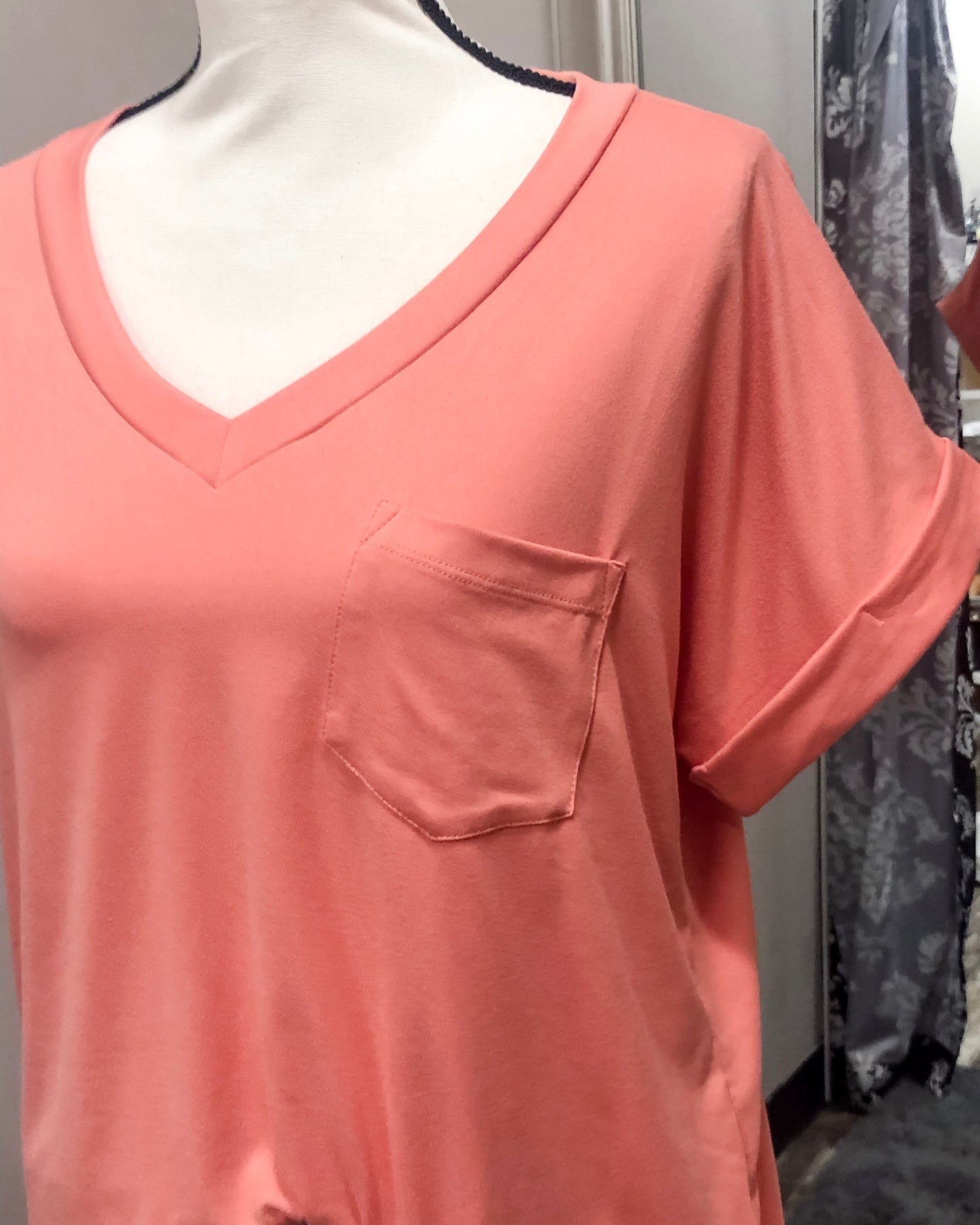 V-Neck Knit Top w/ Pocket - Cantaloupe