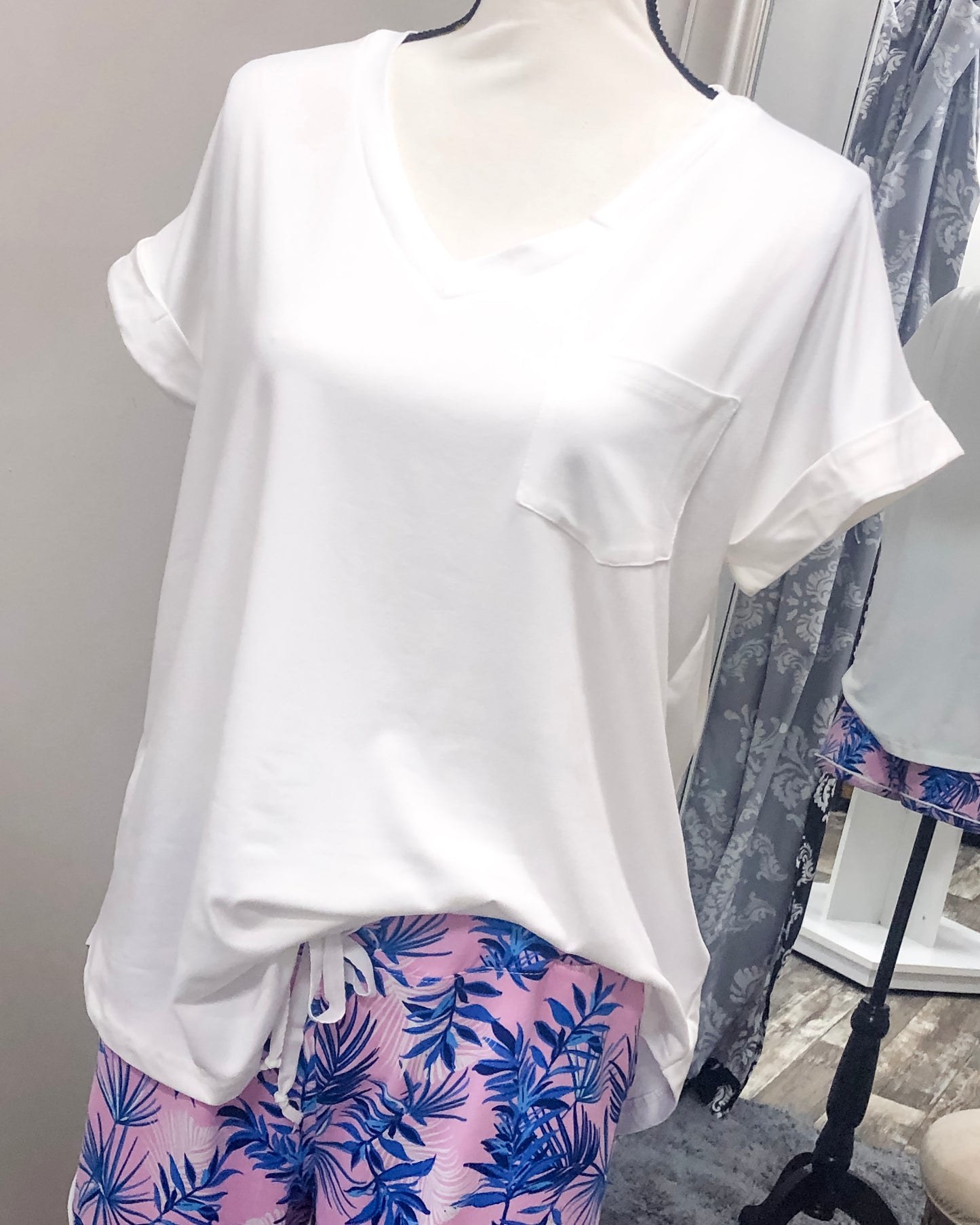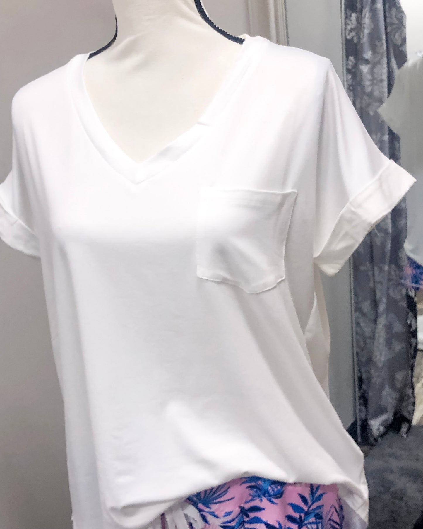 This classic tee is perfect for everything from an afternoon out, to working out, to layering with your favorite blazer for an evening out, and the super soft material is PERFECT for lounging around in your favorite jammies! Features a V neckline, pocket on the front, folded short sleeve.
