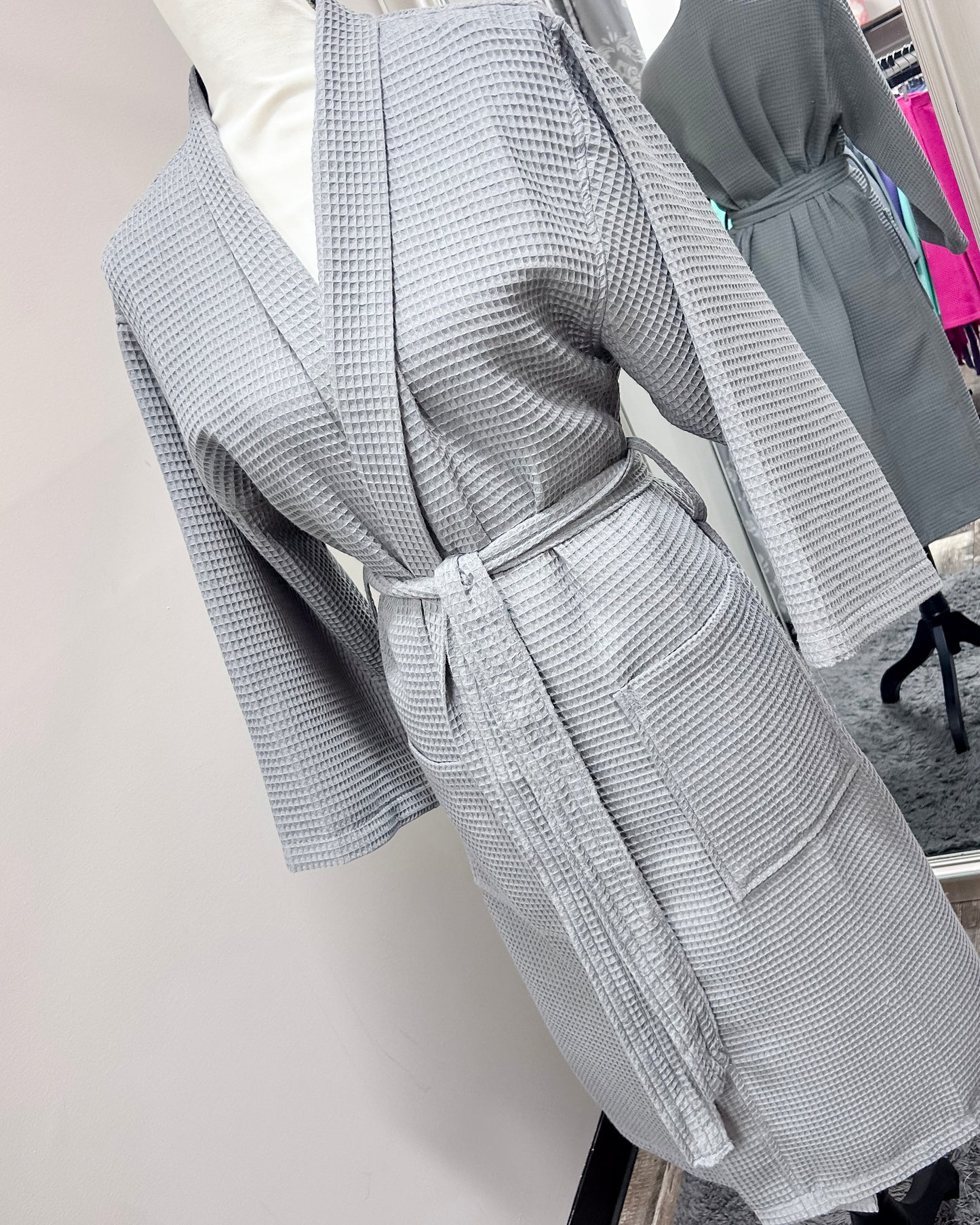 The lightweight material and durable double stitching let each waffle robe hold up after repeated washes - use it for time after time without worry. It's fabric is easy to care for: just machine wash in cool water, then tumble dry on low heat. The material dries quickly so you have it back on the hook in no time. With every wash, the robe remains absorbent and comfortable. Each long waffle robe features a self-tie wrap belt, tailored collar, plus two large pockets.