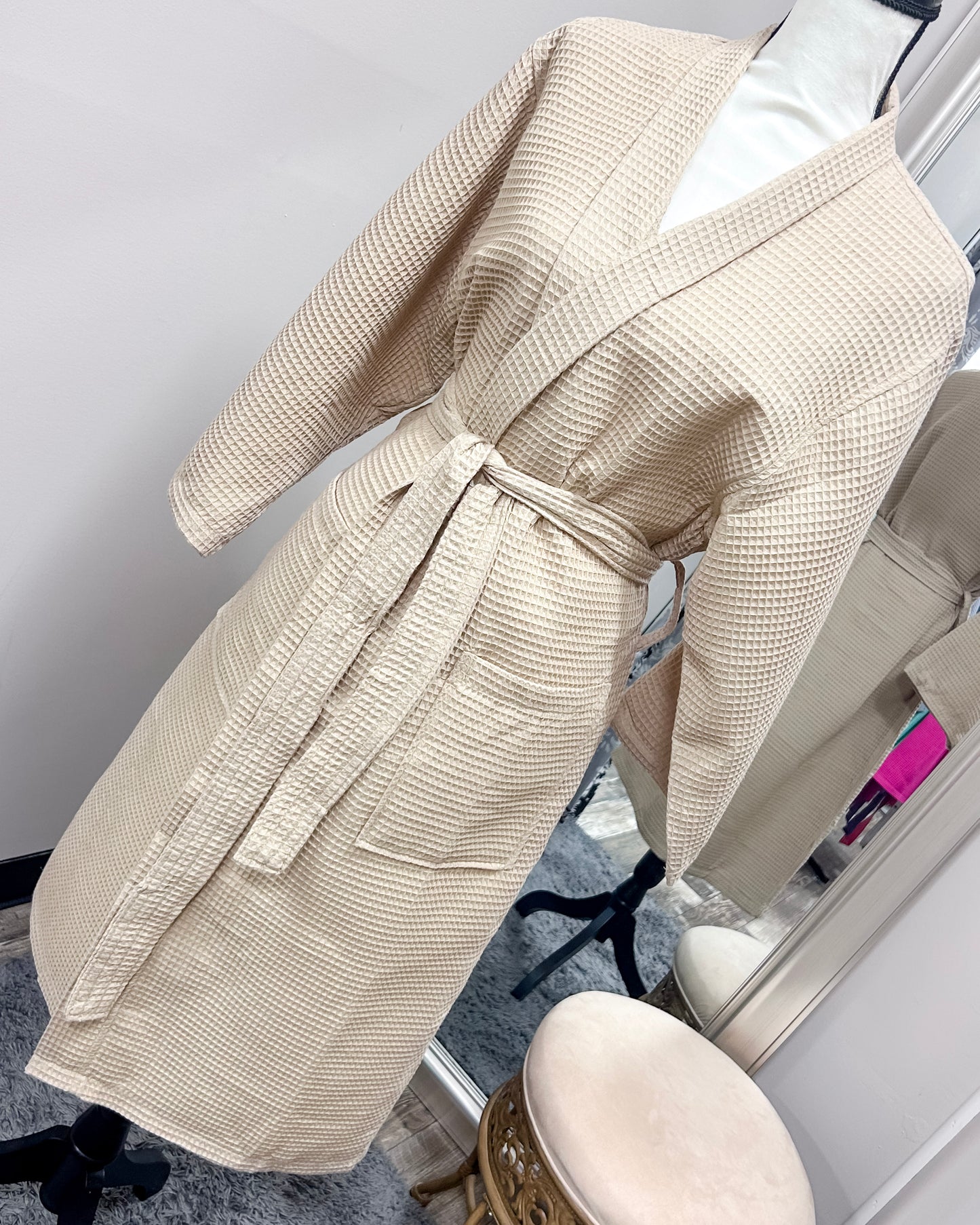 The lightweight material and durable double stitching let each waffle robe hold up after repeated washes - use it for time after time without worry. It's fabric is easy to care for: just machine wash in cool water, then tumble dry on low heat. The material dries quickly so you have it back on the hook in no time. With every wash, the robe remains absorbent and comfortable. Each long waffle robe features a self-tie wrap belt, tailored collar, plus two large pockets.