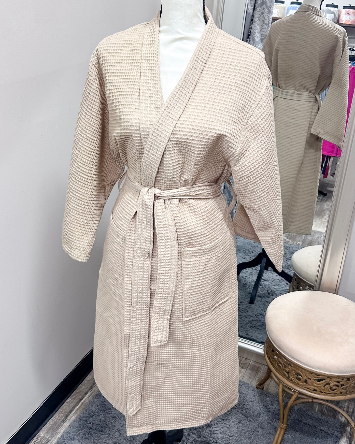 Our long waffle robe is an ideal spa, cover-up or travel robe with a unisex fit. A cotton waffle weave of 60% natural cotton and 40% polyester makes it comfortable to lounge and move freely in. Perfect to slip on after a spa treatment, sauna, or just sitting by the pool, the robe’s softness delivers the ultimate in pampering.