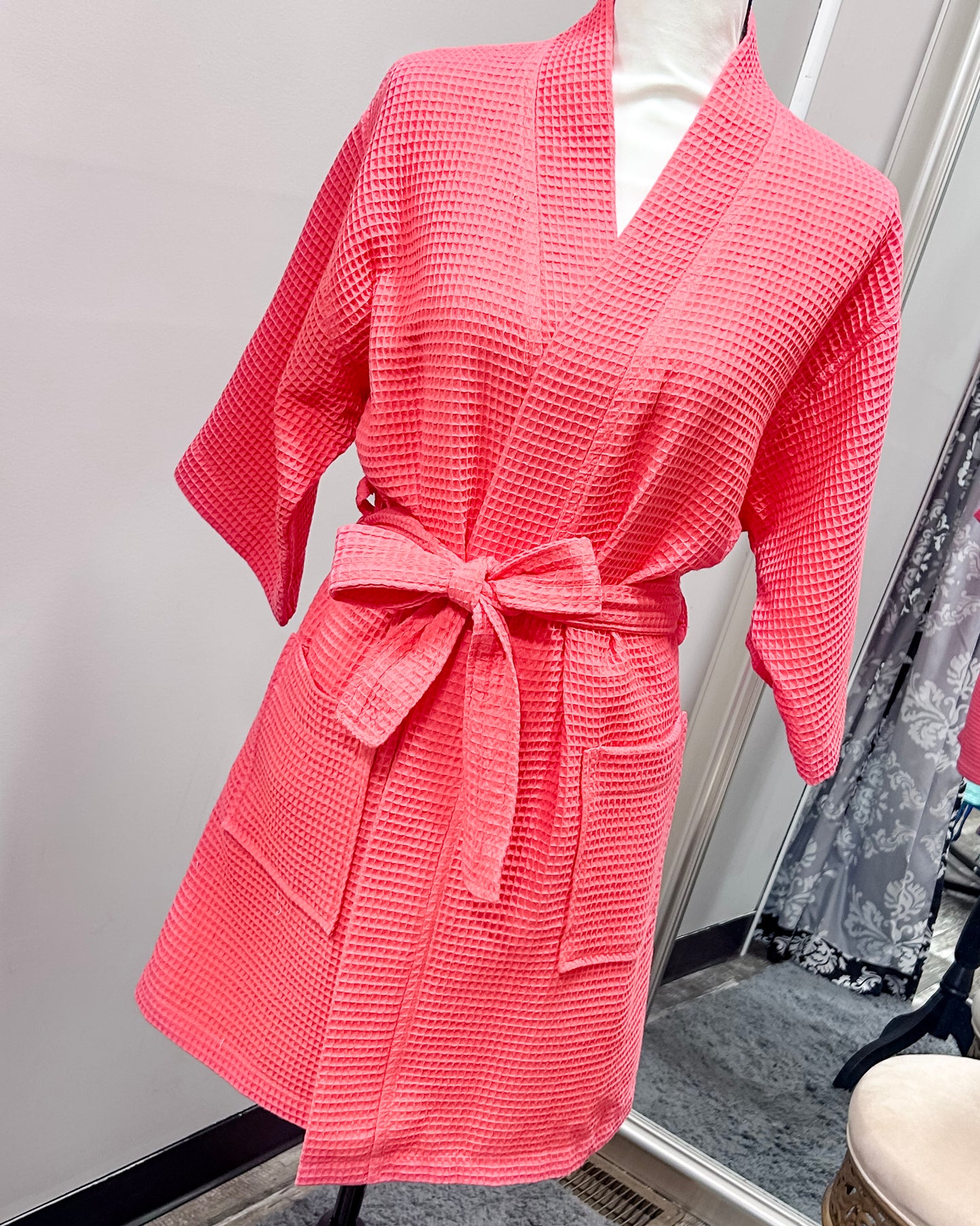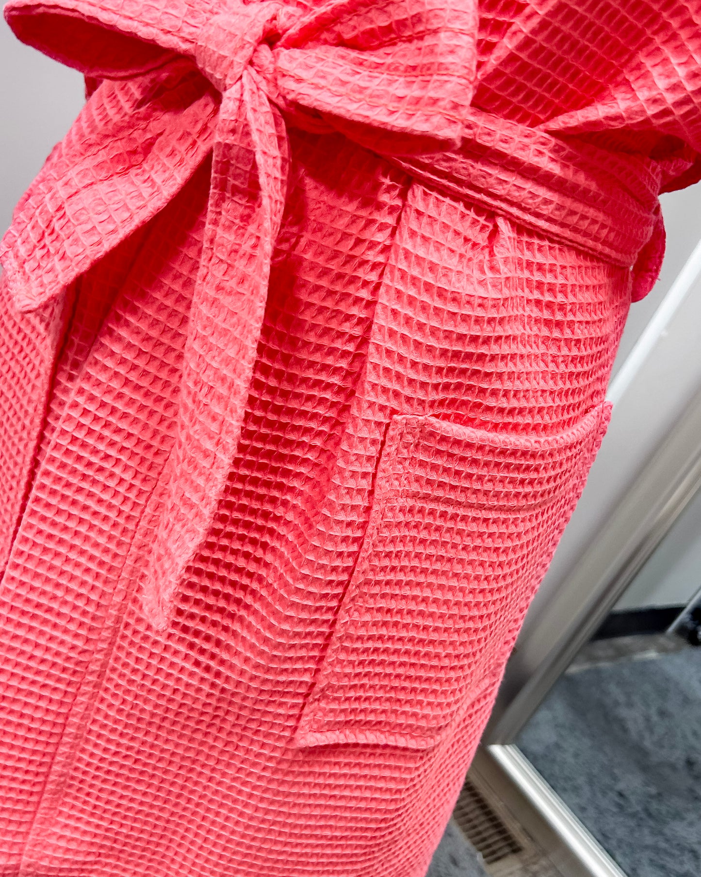 The lightweight material and durable double stitching let each waffle robe hold up after repeated washes - use it for time after time without worry. It's fabric is easy to care for: just machine wash in cool water, then tumble dry on low heat. The material dries quickly so you have it back on the hook in no time. With every wash, the robe remains absorbent and comfortable. Each long waffle robe features a self-tie wrap belt, tailored collar, plus two large pockets.