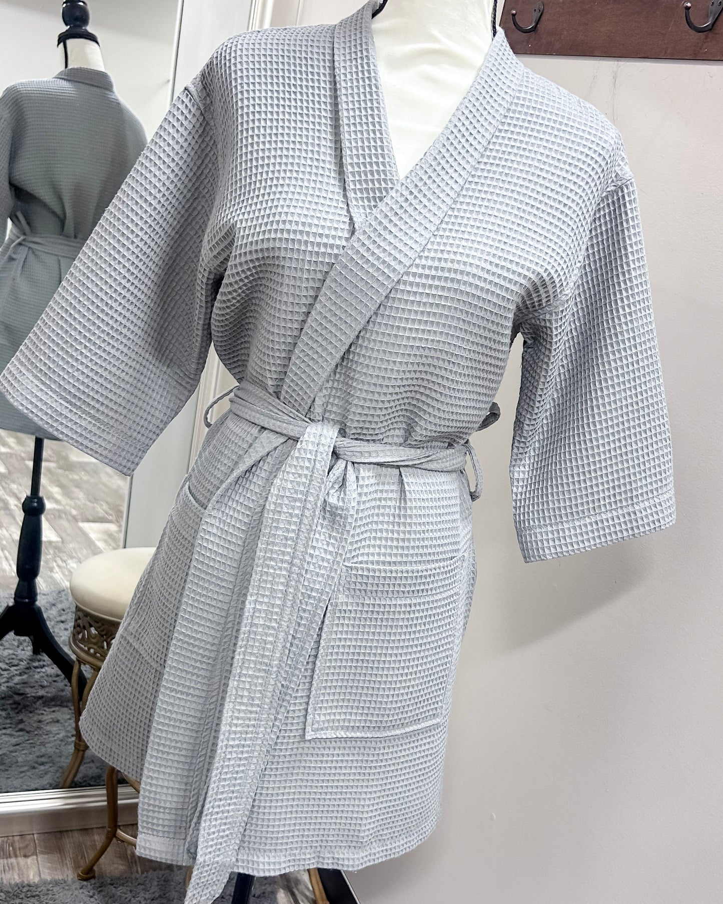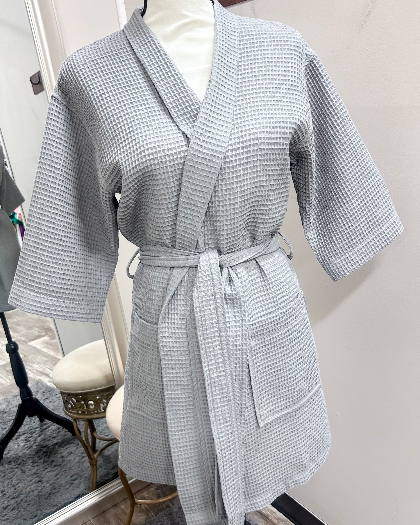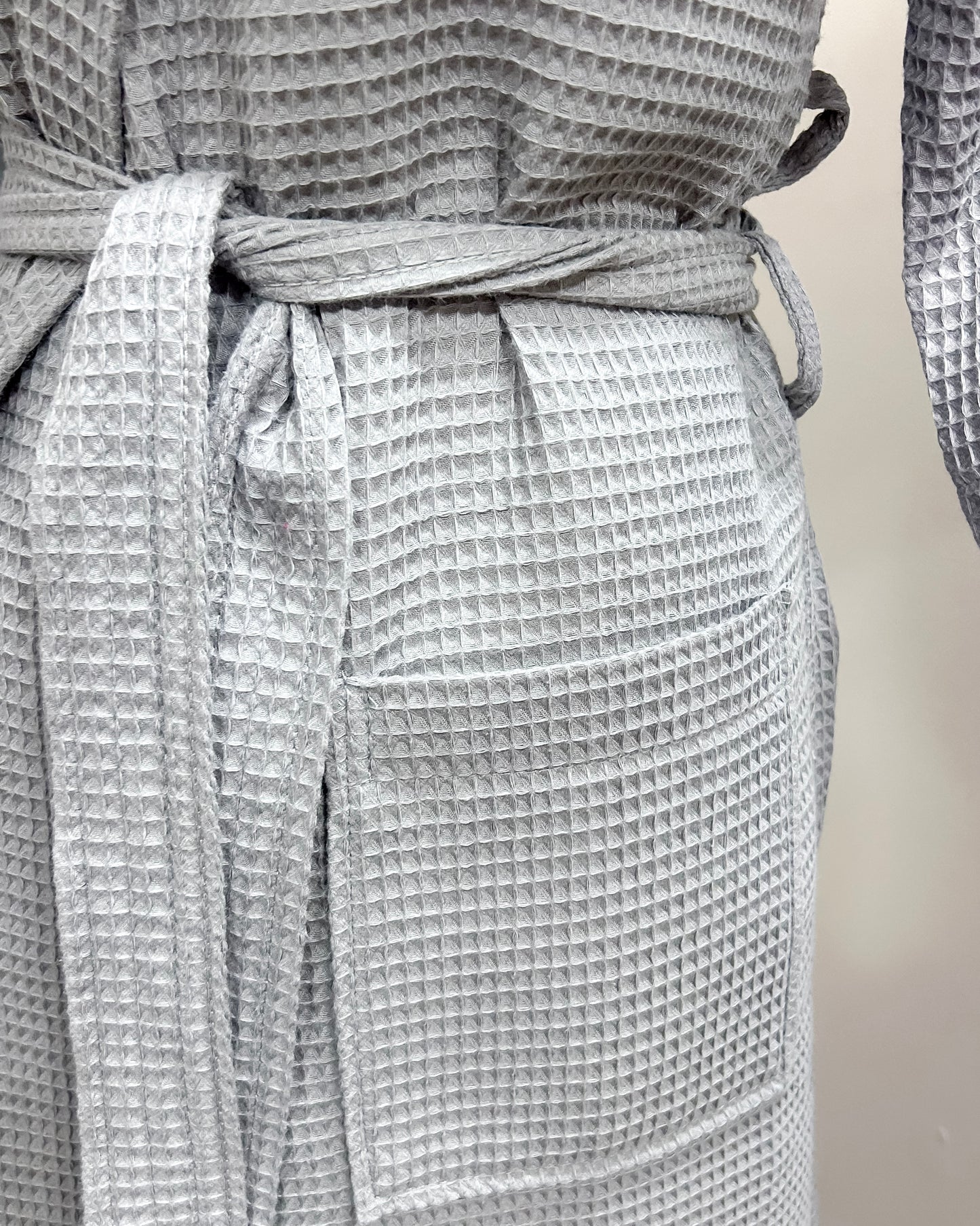 Our long waffle robe is an ideal spa, cover-up or travel robe with a unisex fit. A cotton waffle weave of 60% natural cotton and 40% polyester makes it comfortable to lounge and move freely in. Perfect to slip on after a spa treatment, sauna, or just sitting by the pool, the robe’s softness delivers the ultimate in pampering.